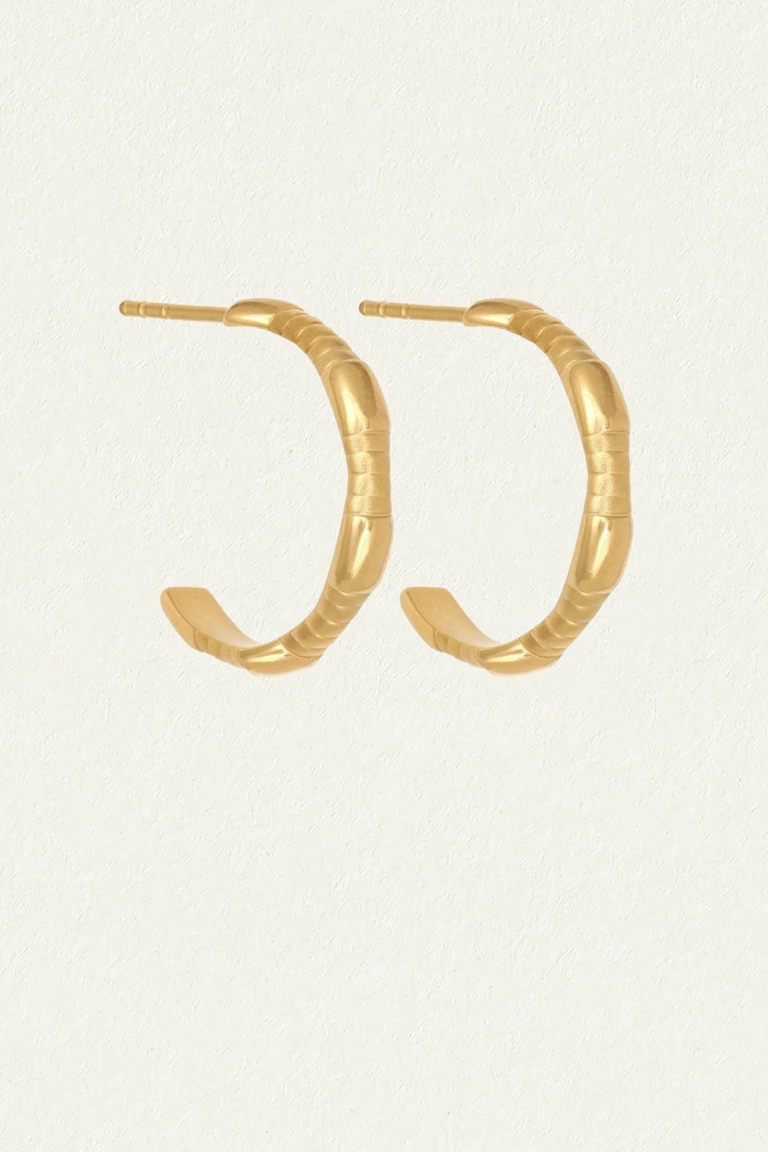 Crafted from 18k gold vermeil, the Amari Hoops are mid-sized open hoop earrings with a contoured form. Polished raised sections contrast with ridged matte textures, creating subtle depth and distinction.