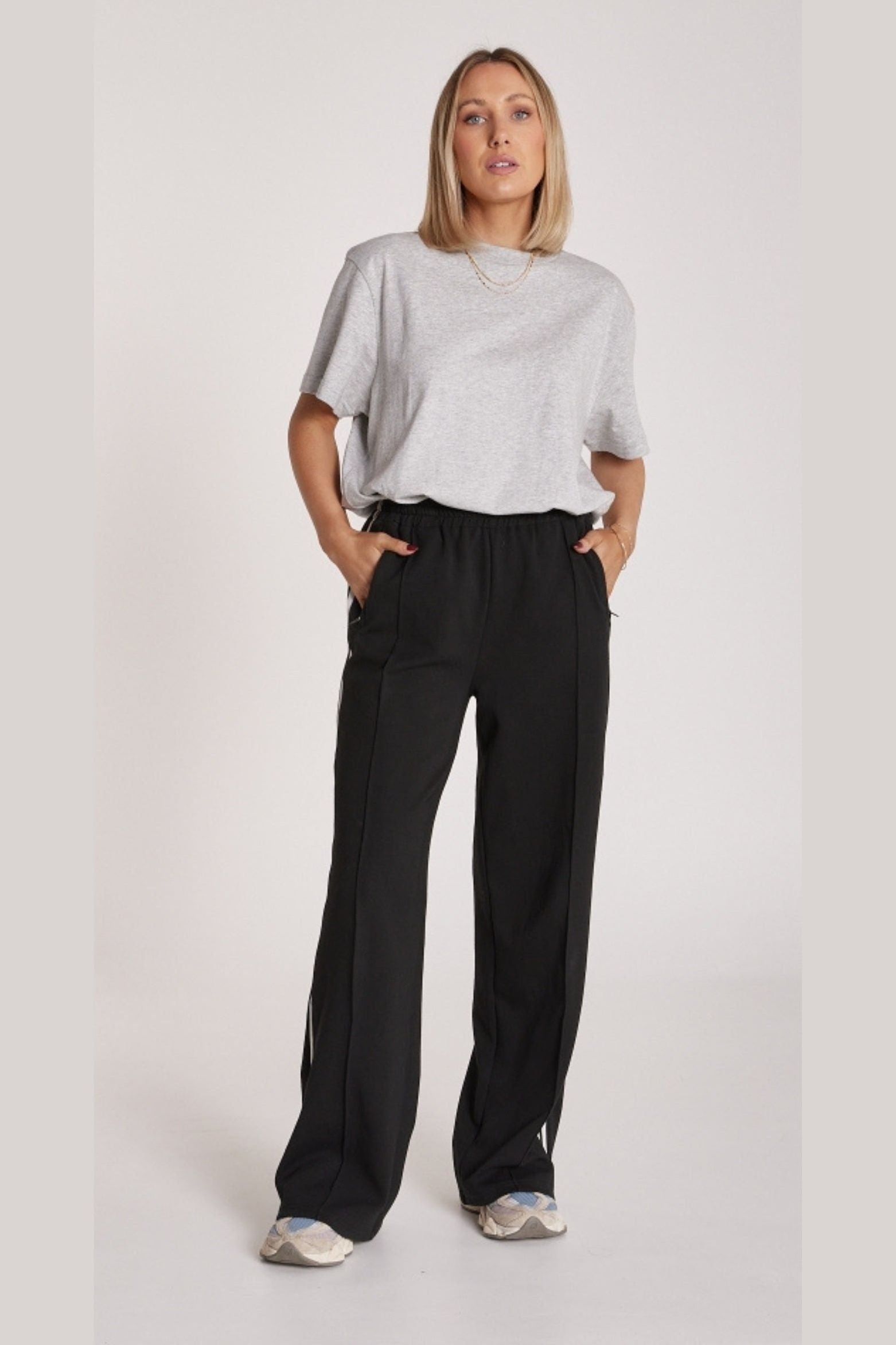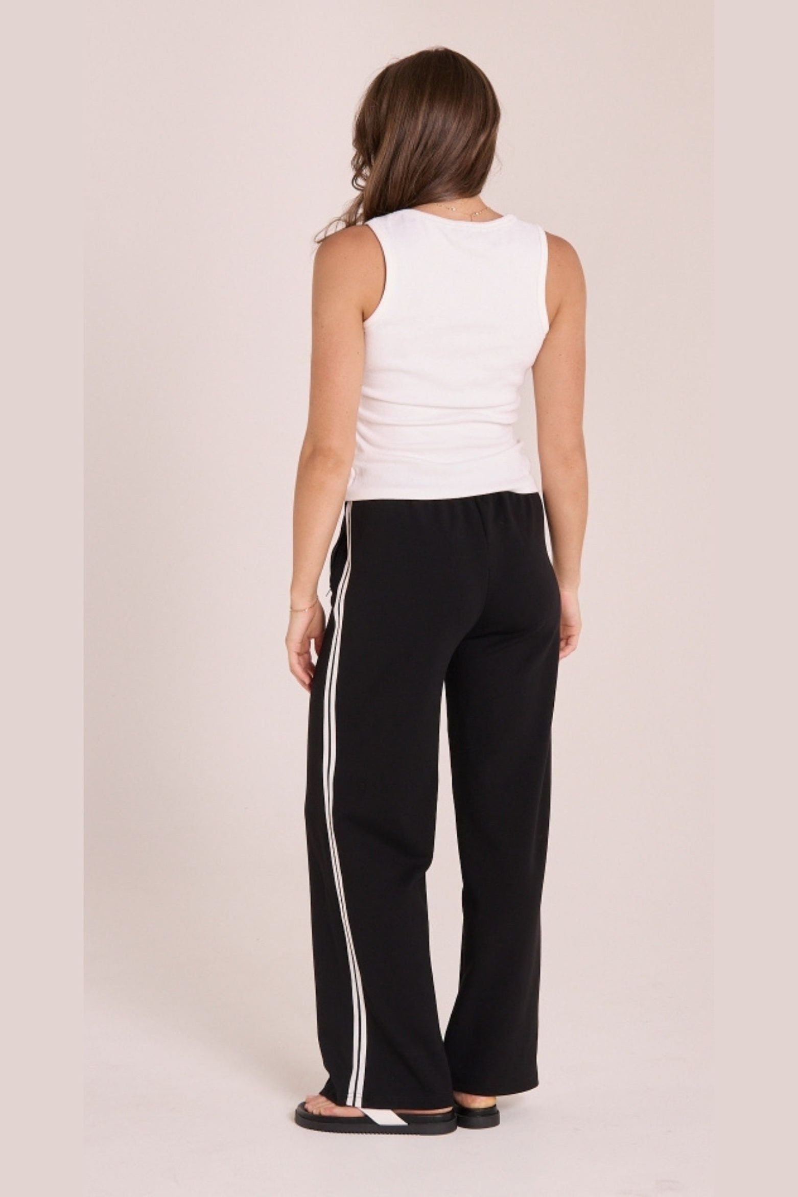 Where cool and comfortable combine, our incredible ‘Noah Wide Pant’ is the effortless and stylish twist on the classic track pant you didn’t know you needed!! Features include, elasticated waist, twin side taping stripe detailing, wide leg, side pockets with zips, pintuck detail on centre front leg, relaxed styling all finished in a beautiful cotton blend fabrication. Pair with our ‘Dayna Tank’ in White for an easy yet stylish look!