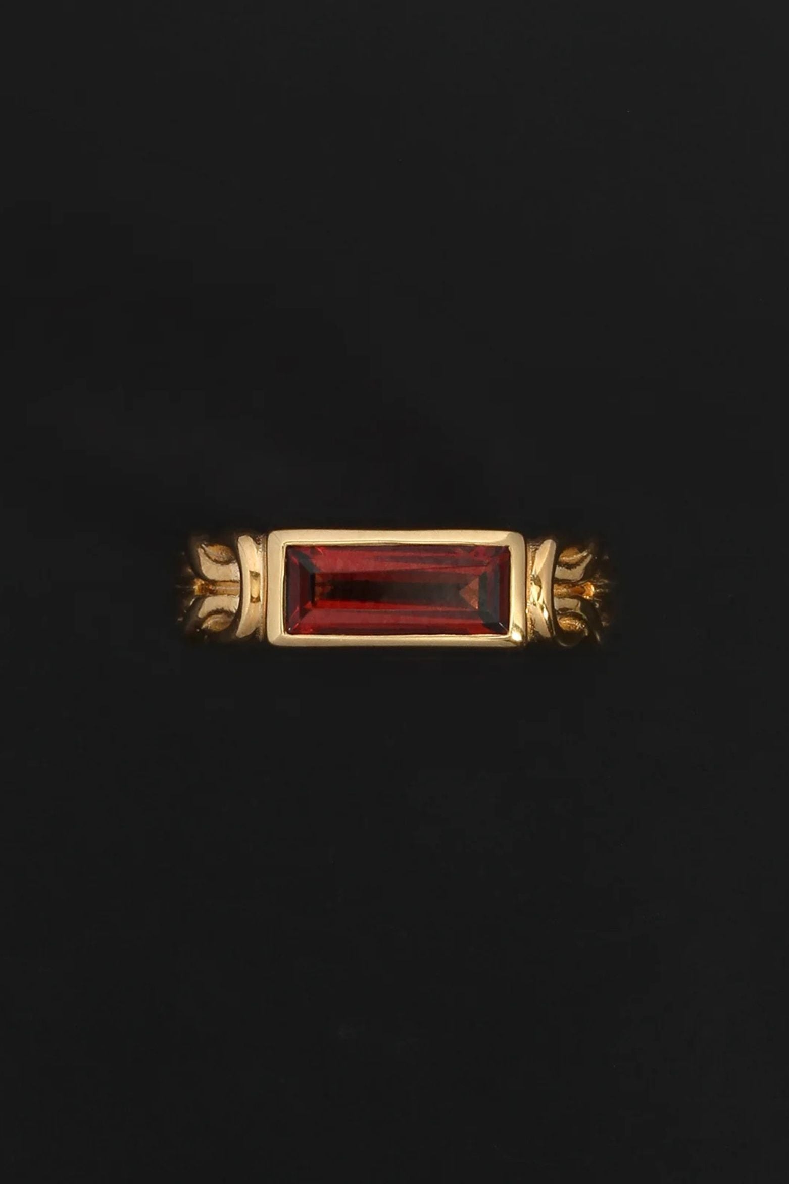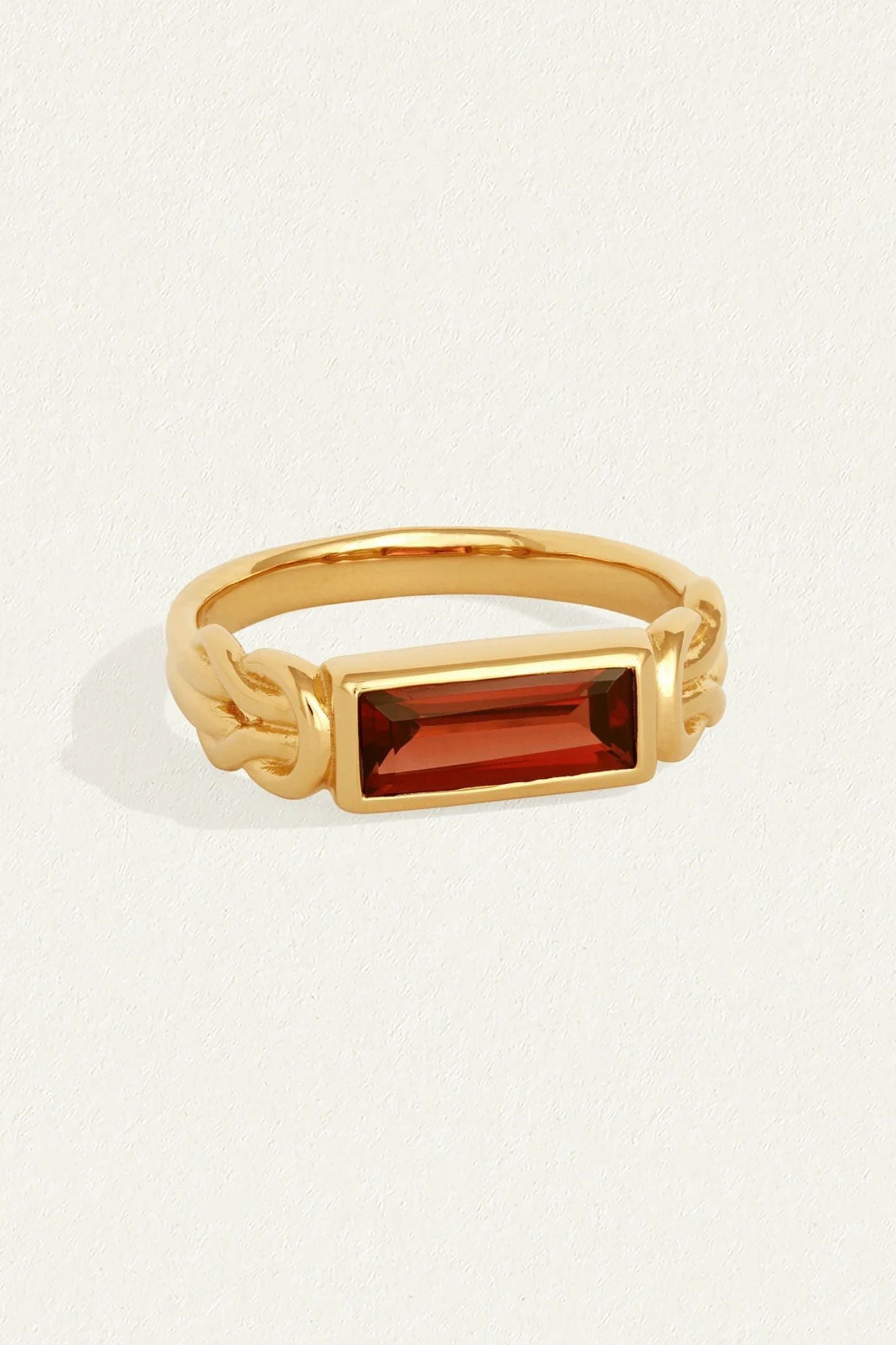 The Airla Ring is a solitaire design featuring an east-west set baguette-cut garnet. The 18k gold vermeil band is formed by two cord-like strands, joined at the shoulders with love knots. Inspired by ancient tradition, the Herakles knots symbolise eternal love and enduring connection, their continuous loops echoing the rhythms and cycles of life.