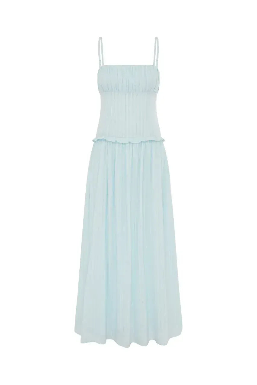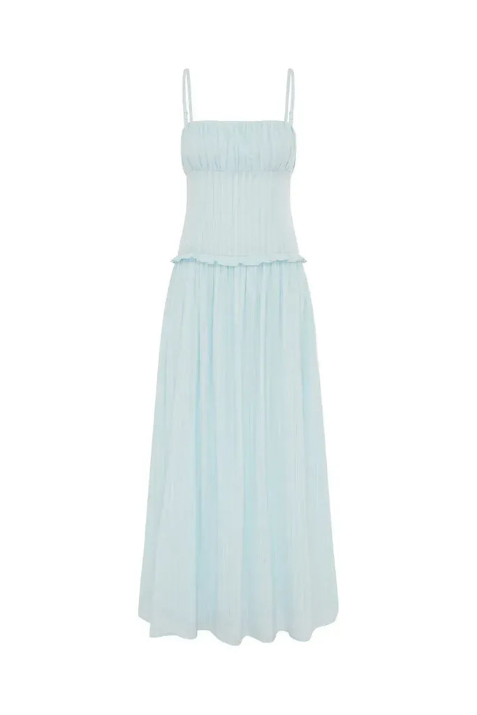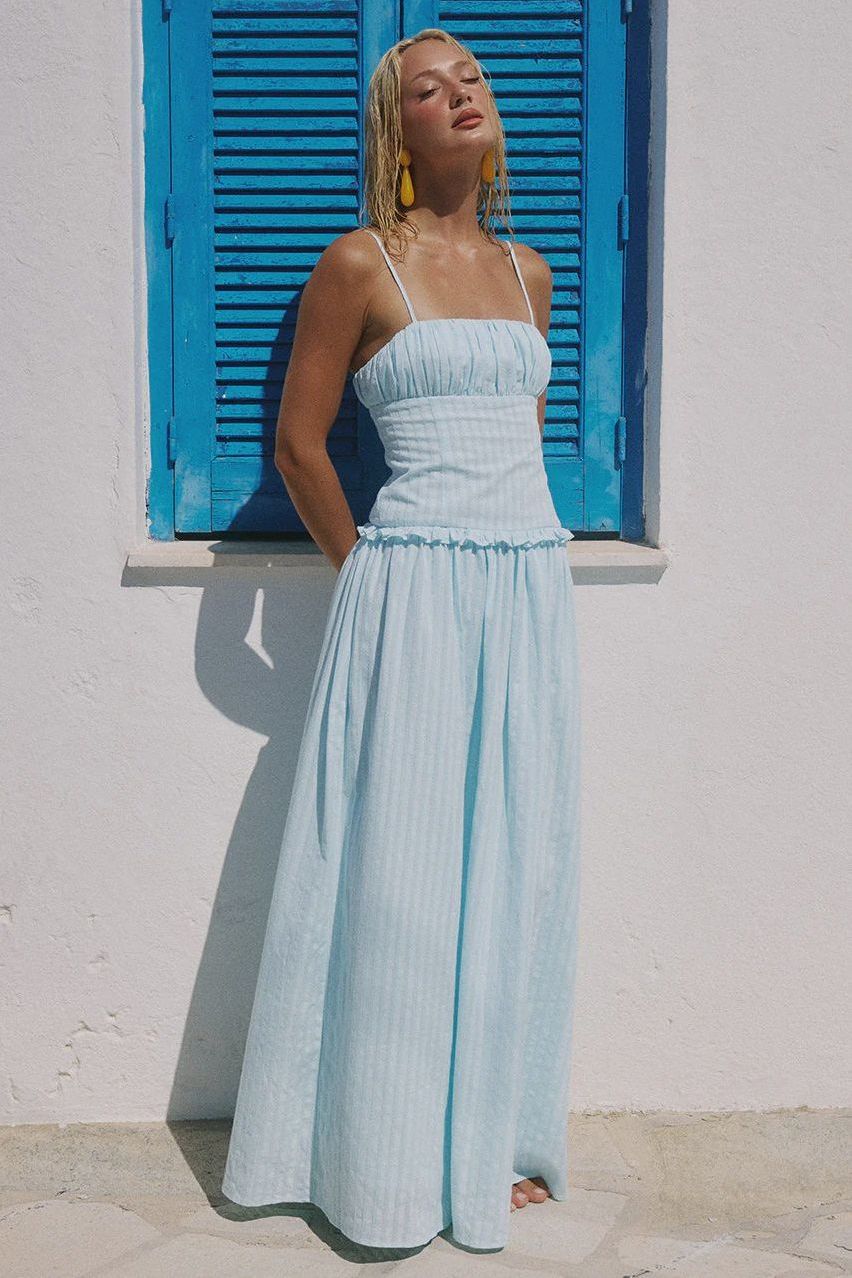 The Keily Maxi Dress pairs a ruched bodice with soft pleating, delicate ruffle trim, and a flowing skirt for effortless warm-weather style.