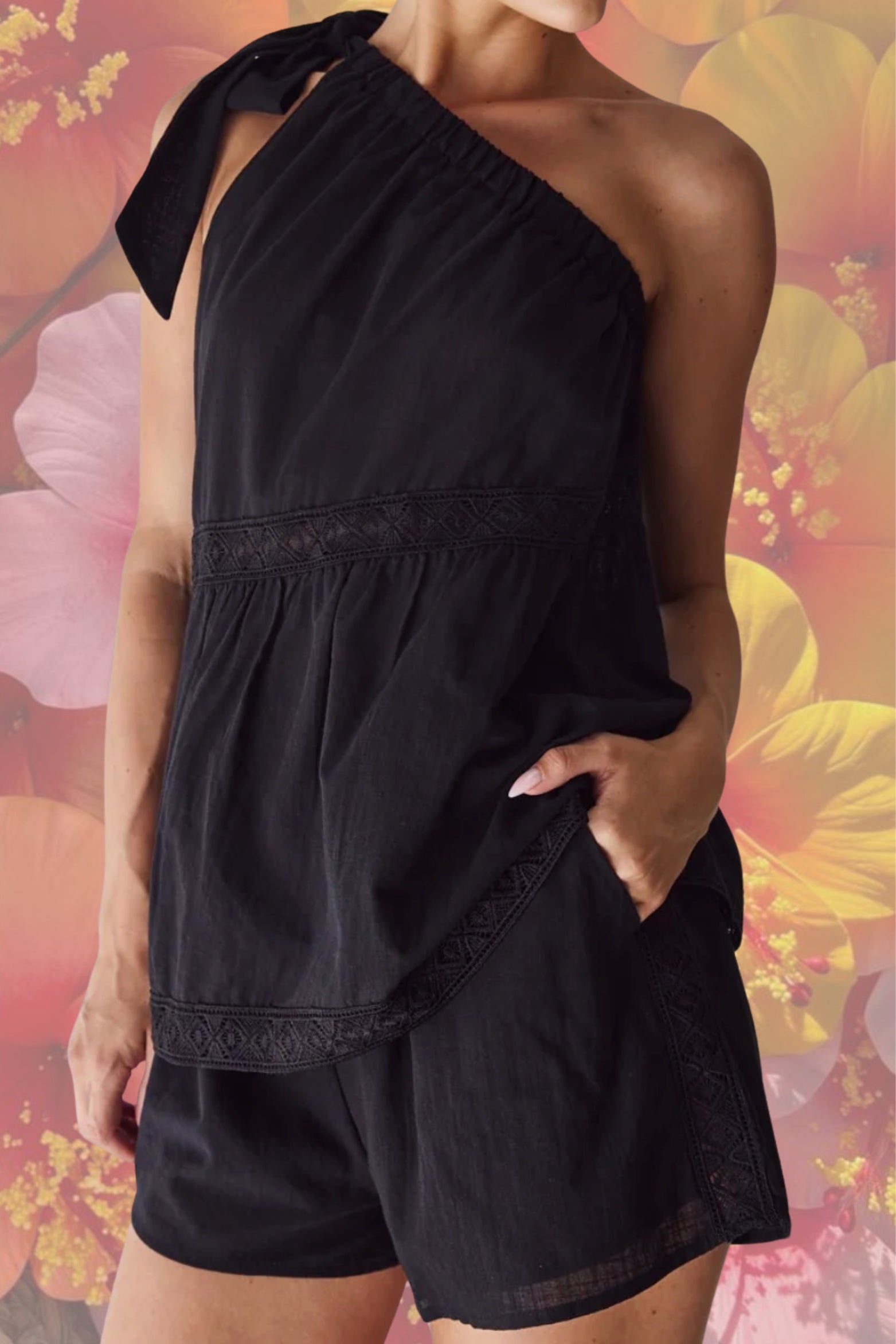 - Lace trimming along side seam