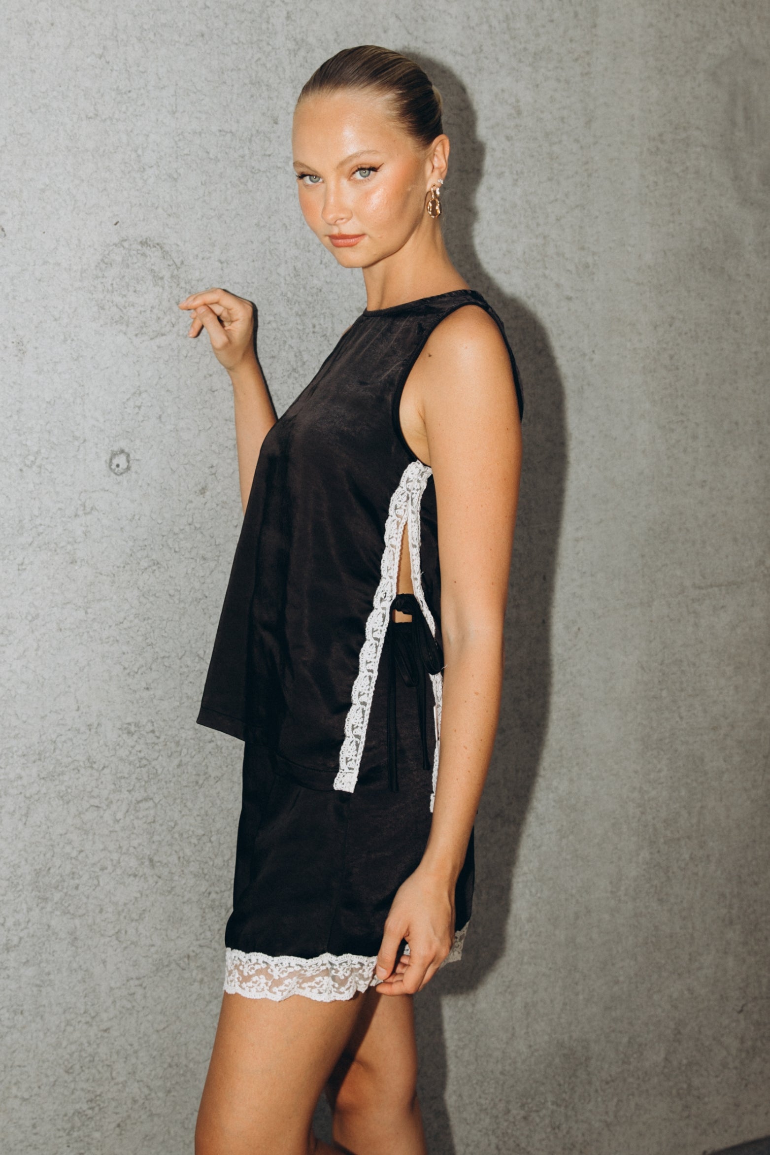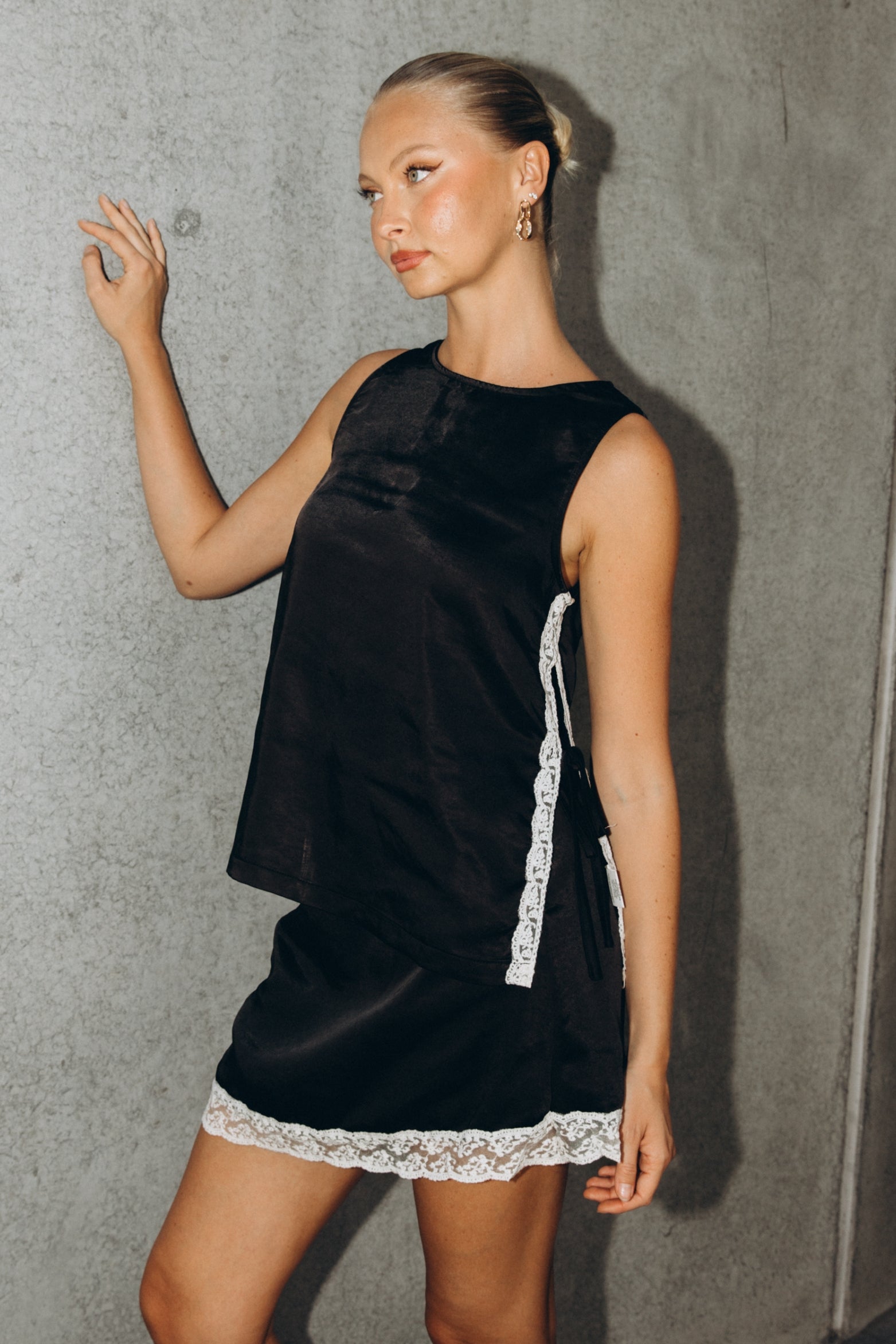 Elevate your everyday with the Joyce Satin Top—a playful take on timeless elegance. Luxe satin like fabric drapes beautifully against your skin, while delicate lace trim adds a touch of romance. Adjustable tie sides let you customize the fit to perfection, creating a flattering silhouette that moves with you. Versatile enough for brunch or date night, this top is your new wardrobe essential.