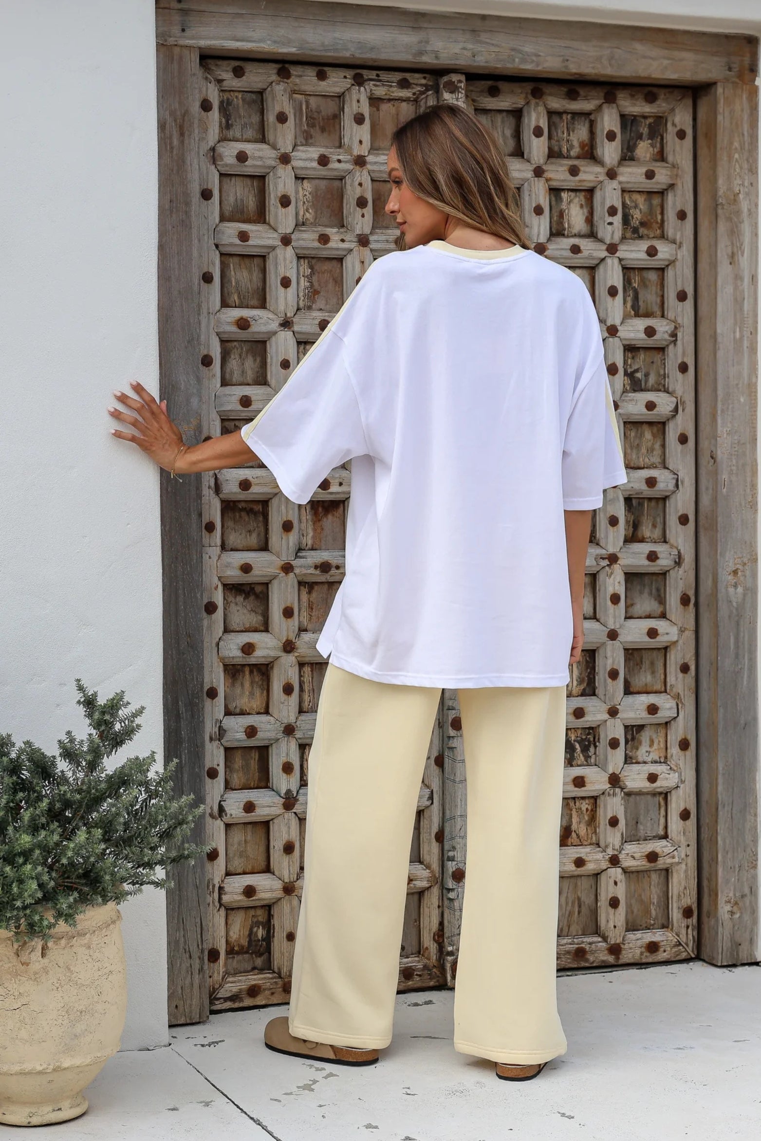 The LUCY OVER SIZED BOYFRIEND TEE is a relaxed, comfortable essential crafted from 100% cotton. Available in two classic colourways—White with Yellow and White with Chocolate—this oversized boyfriend fit offers effortless style for everyday wear. Perfect for layering or wearing solo, it's a versatile wardrobe staple that works with everything.