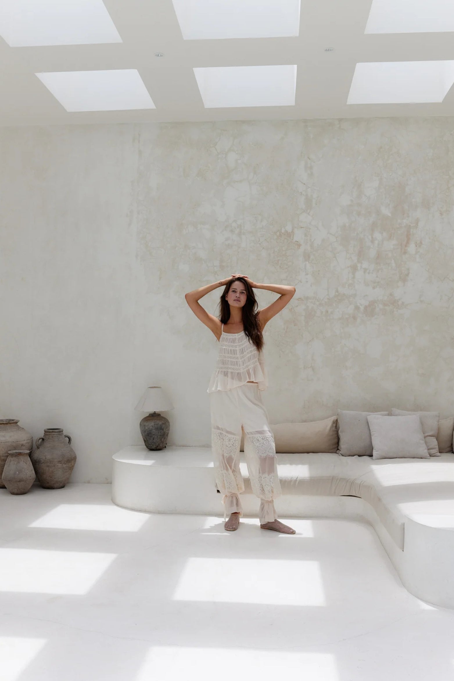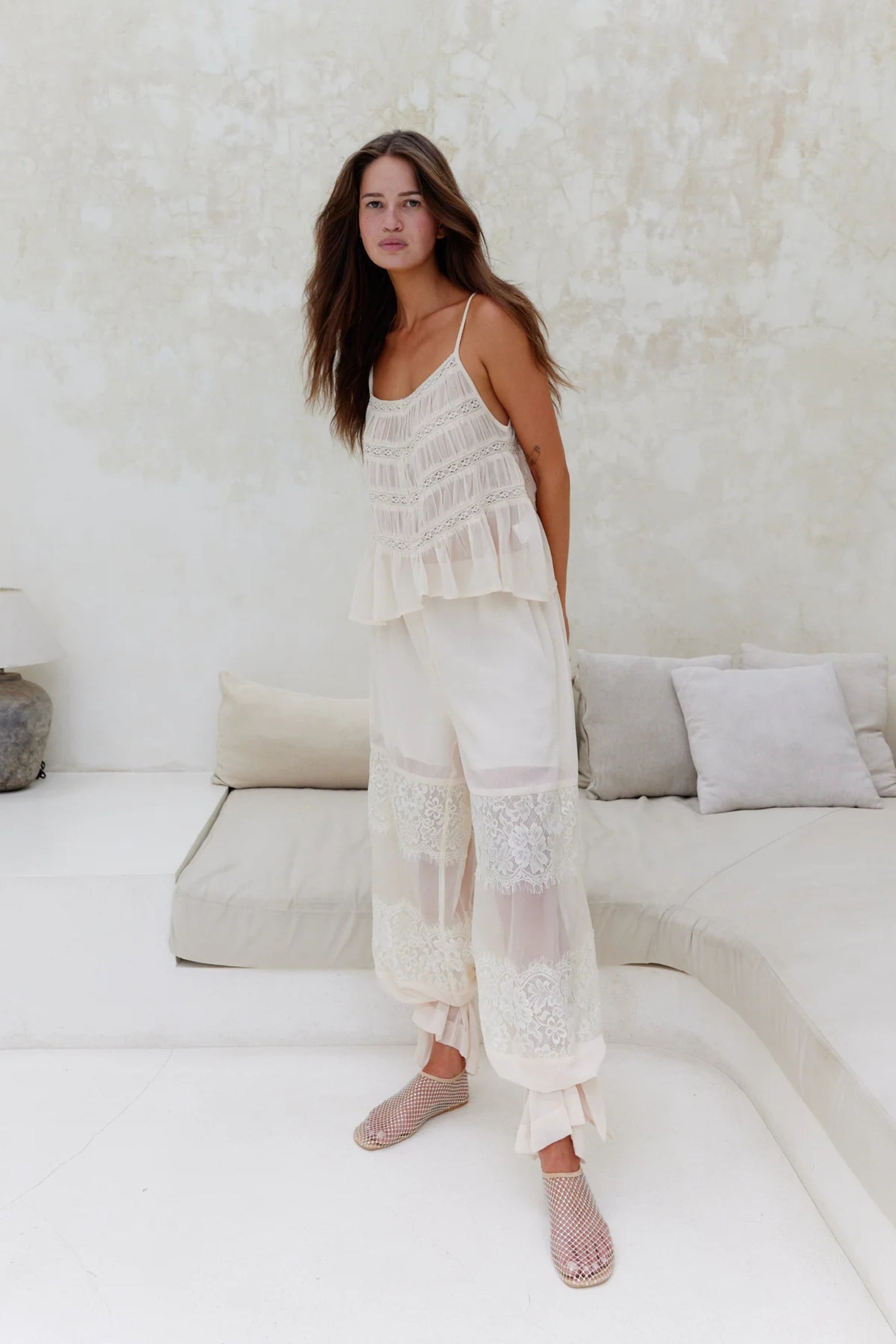 The Zinnia Harem Pant in textured chiffon features delicate lace trim and a playful detachable leg cuff tie that transforms them into wide-leg pants. With a soft rayon lining and a comfy elasticated waist, these pants bring effortless style and versatility to any.