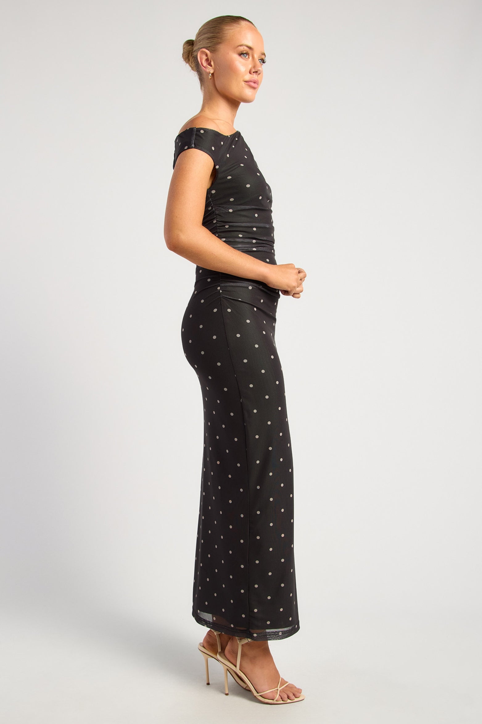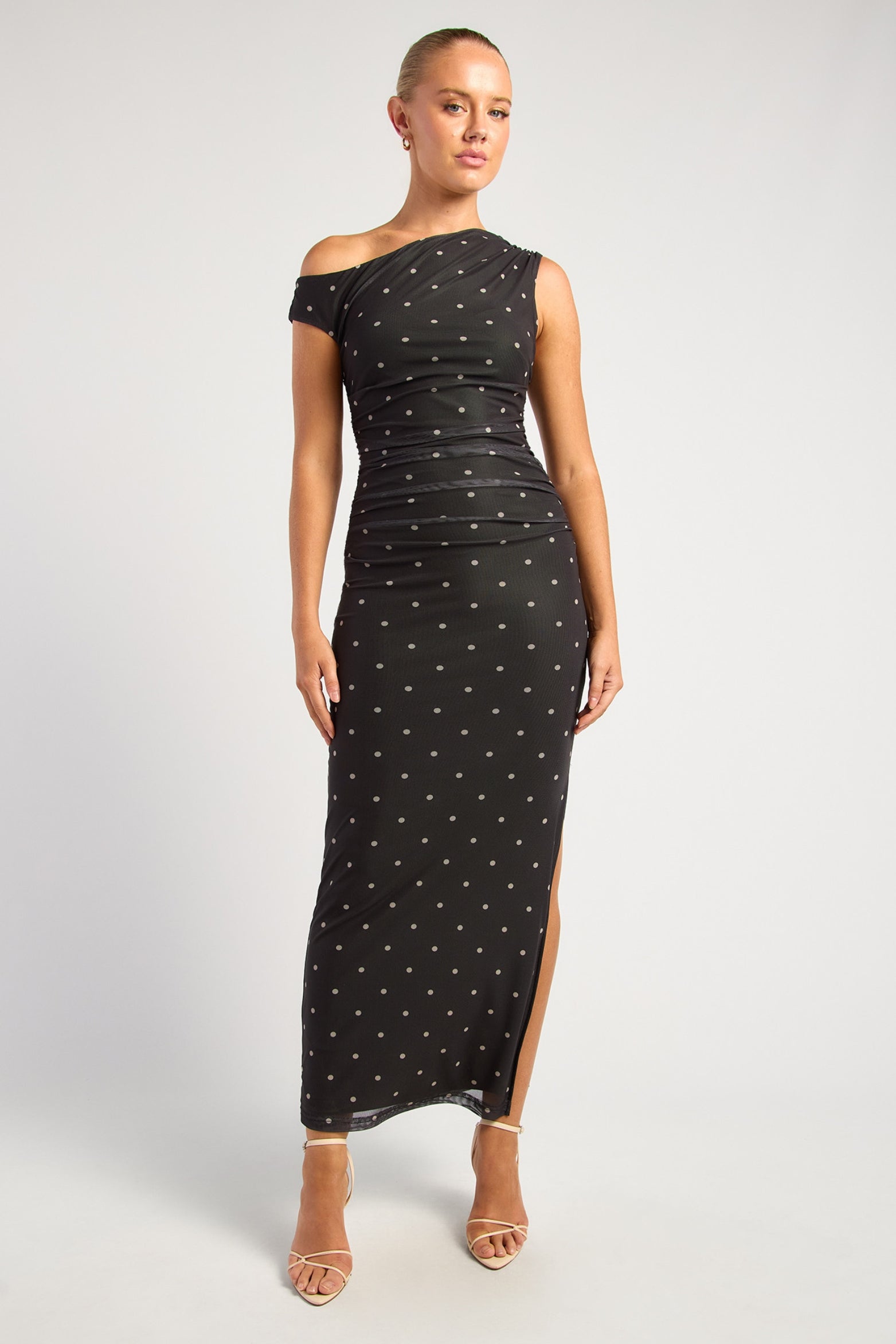 Make a statement in this black mesh maxi dress where elegance meets playful sophistication. The off-shoulder silhouette draws attention upward, while the side split creates dynamic movement with every step. Practical side zip fastening keeps the focus on the dress's refined details, and the polka pattern adds a hint of whimsy to your formal look. Designed for those who refuse to choose between classic and contemporary.