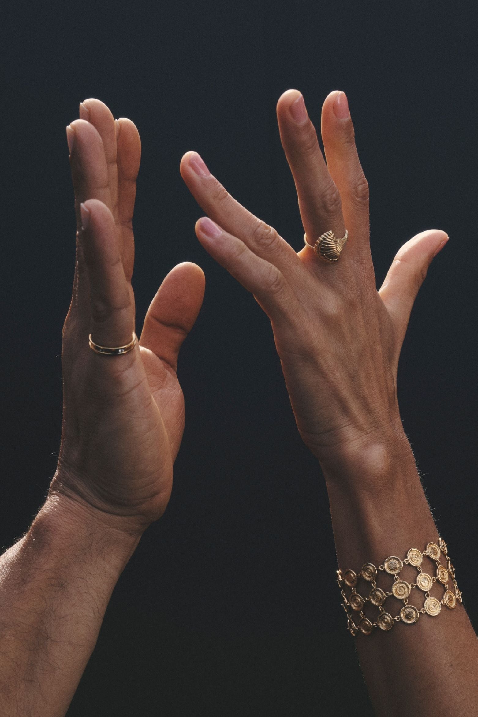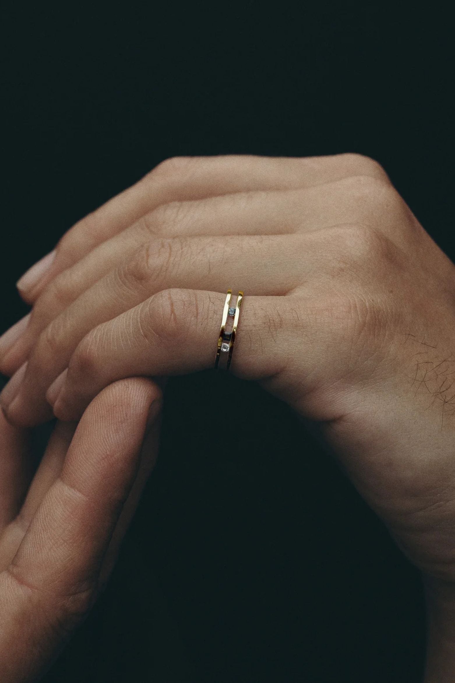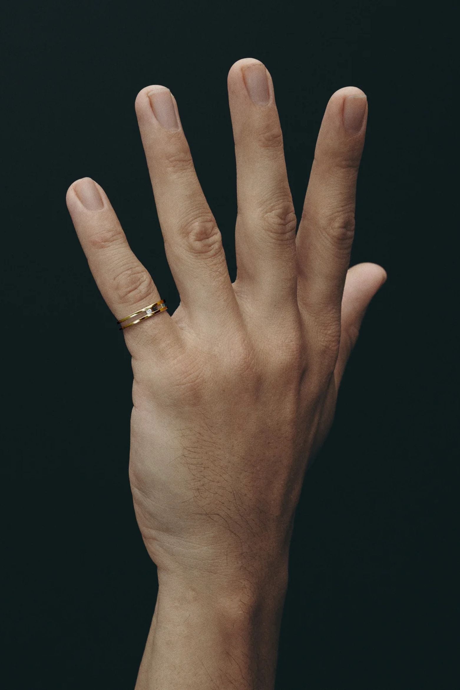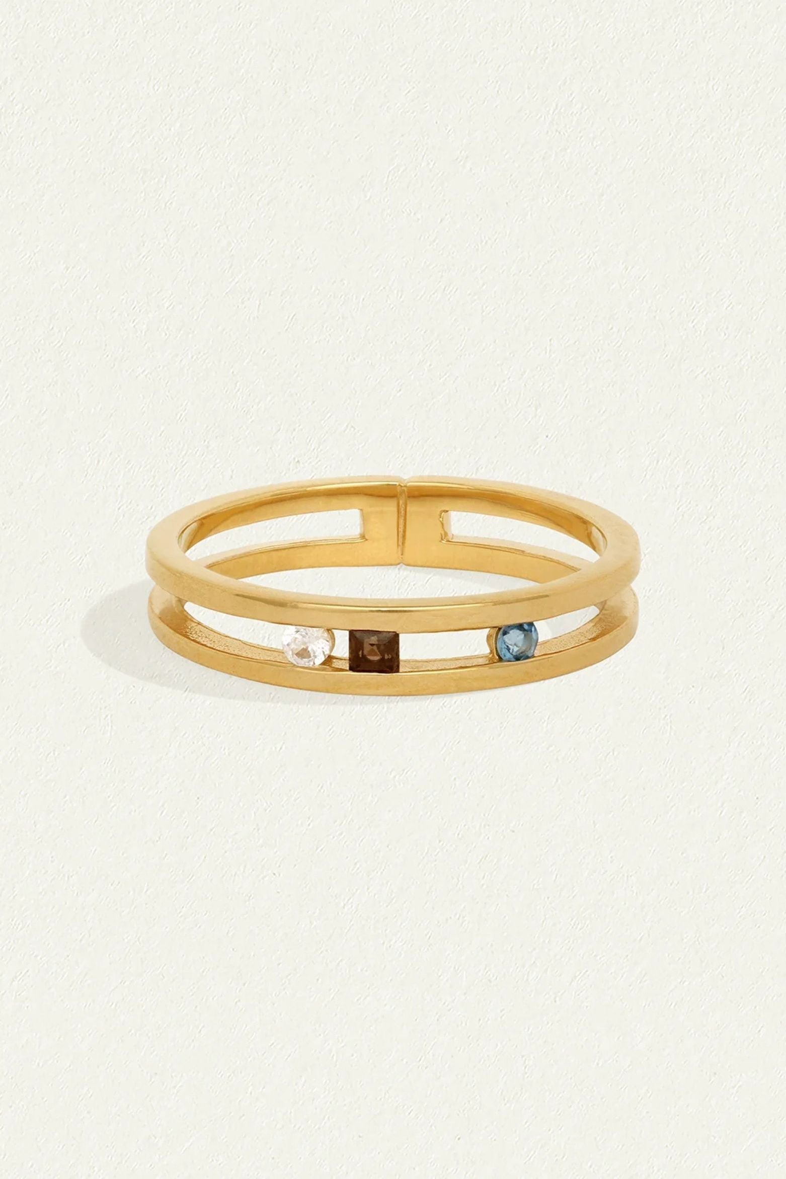 Crafted from 18k gold vermeil, the contemporary Ceto Ring features an open band with channel-set natural zircon, London blue topaz, and smoky quartz.