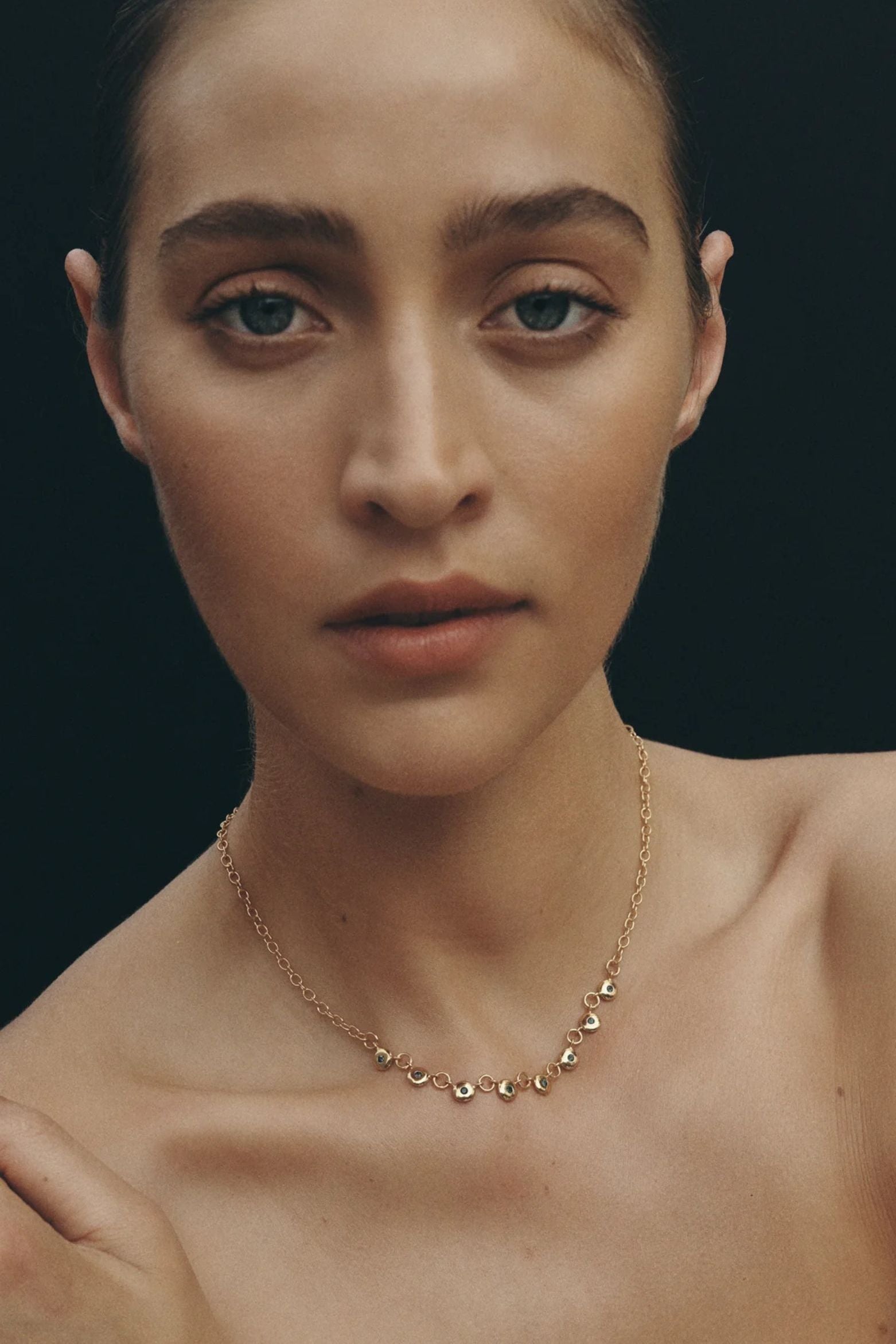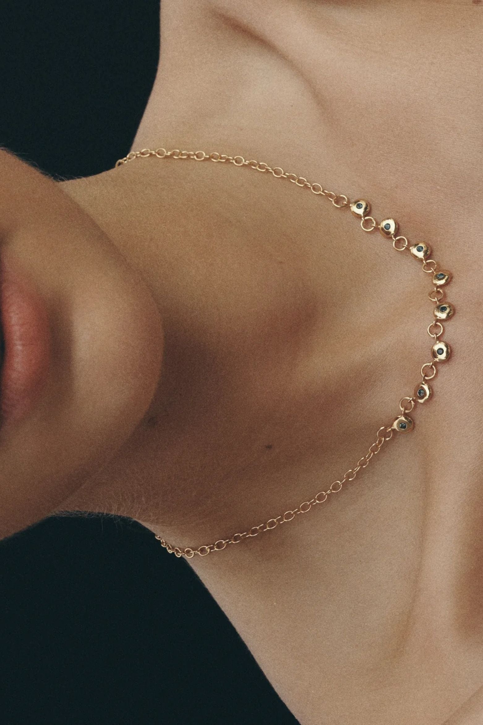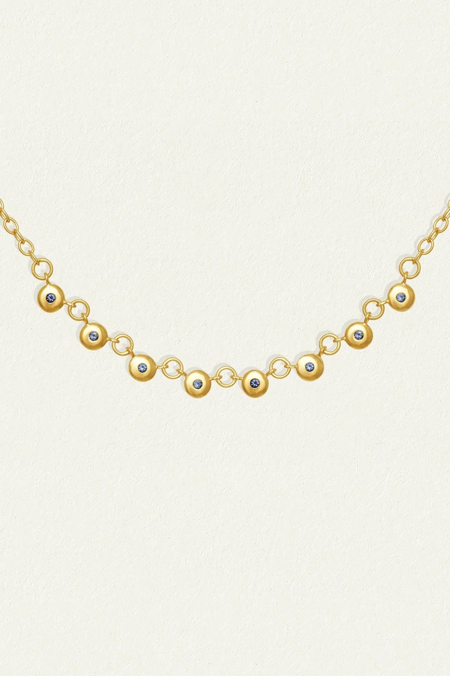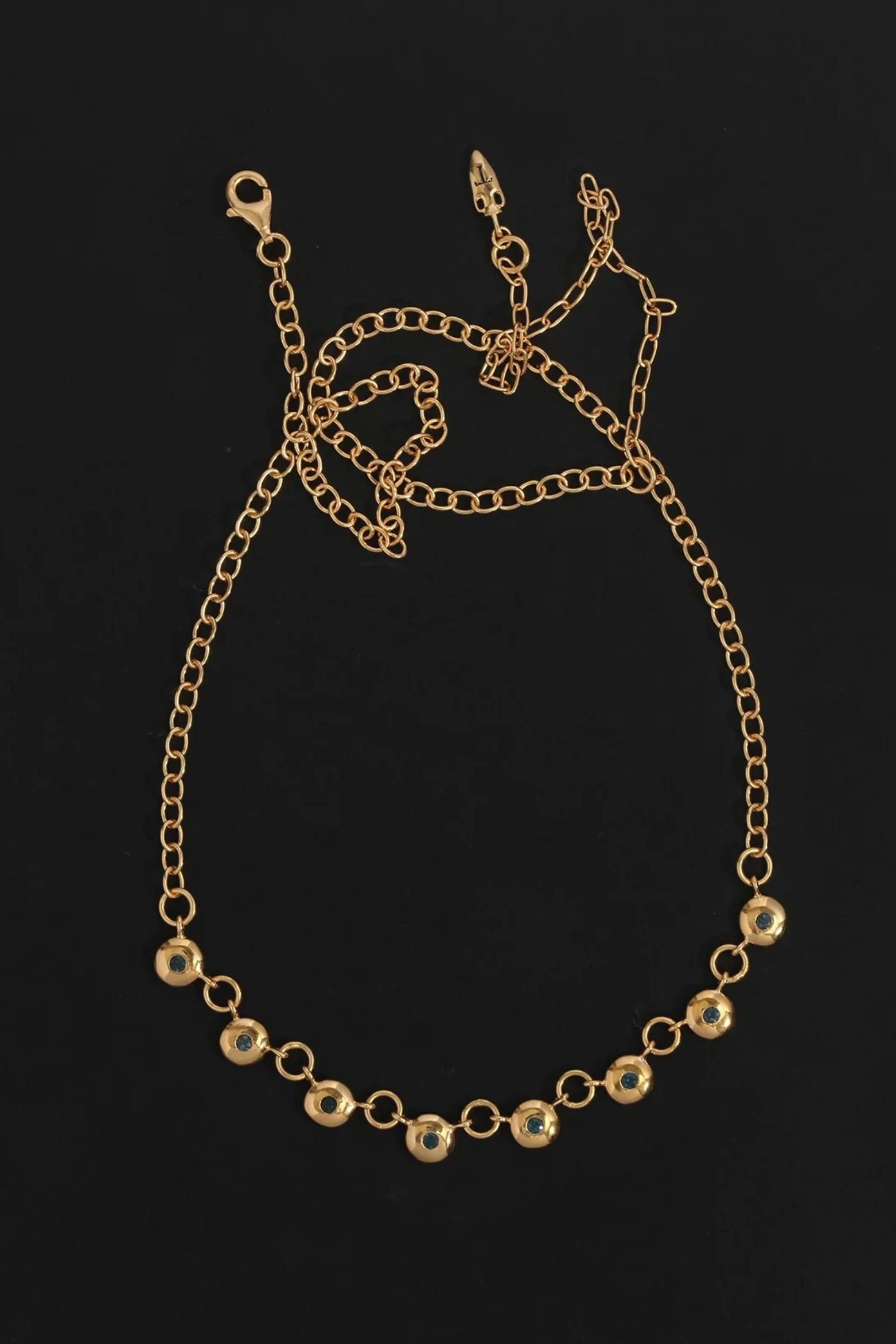 The Mavi Necklace features polished 18k gold vermeil lentil discs, each set with blue topaz in a refined interpretation of the protective evil eye. Linked in sequence along a round link chain, each element moves with the wearer, while the teal gemstones embody the bracelet's Turkish name meaning "blue".