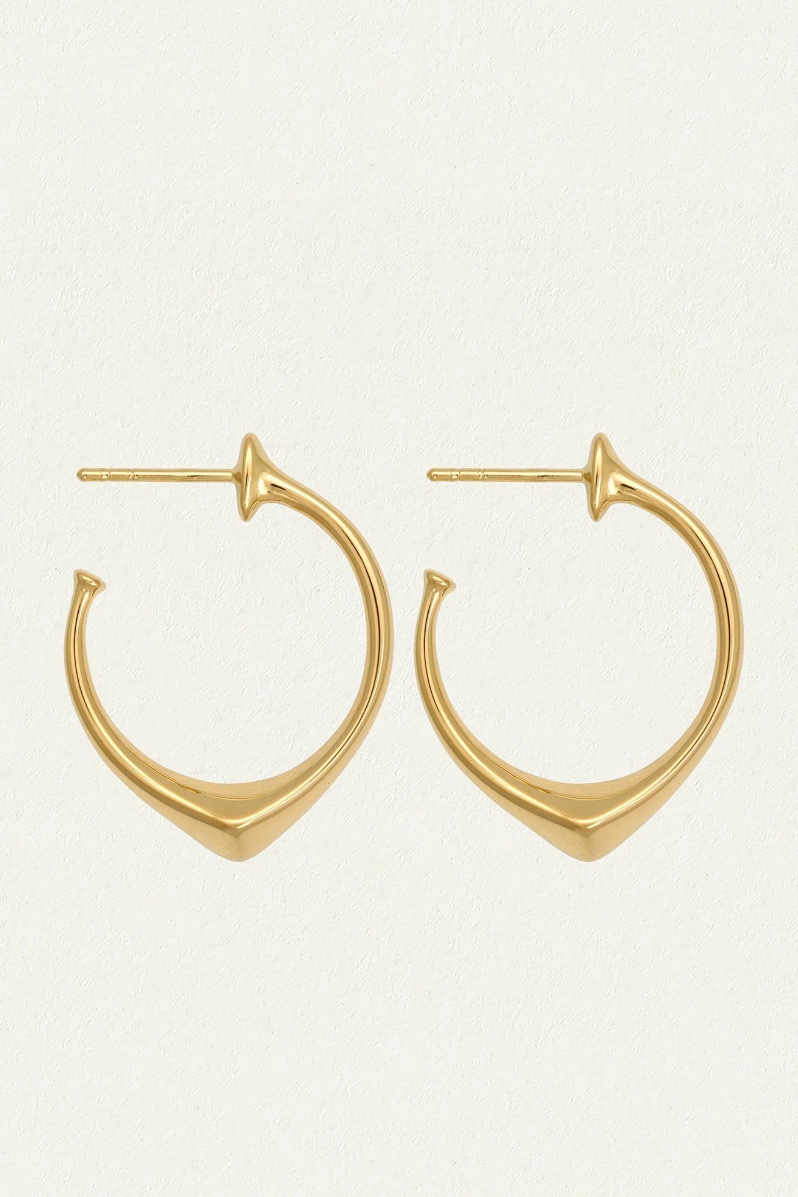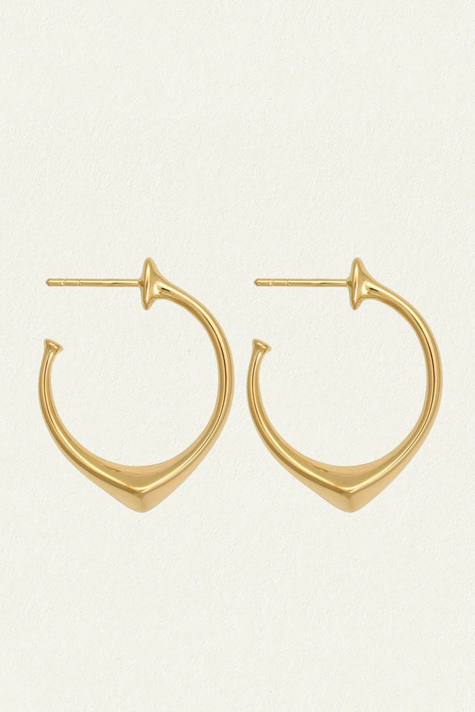Handcrafted in 18k gold vermeil, these open hoop earrings are distinguished by their angular silhouette, with a polished knife-edge profile that tapers to a soft point. Sleek and sculptural, their reflective surface catches the light with each movement.