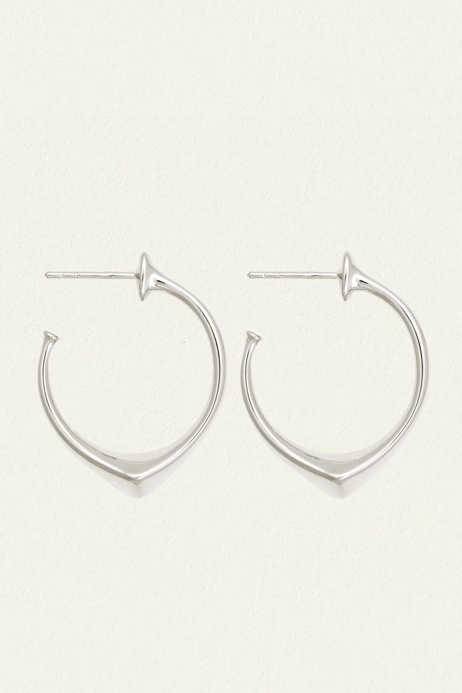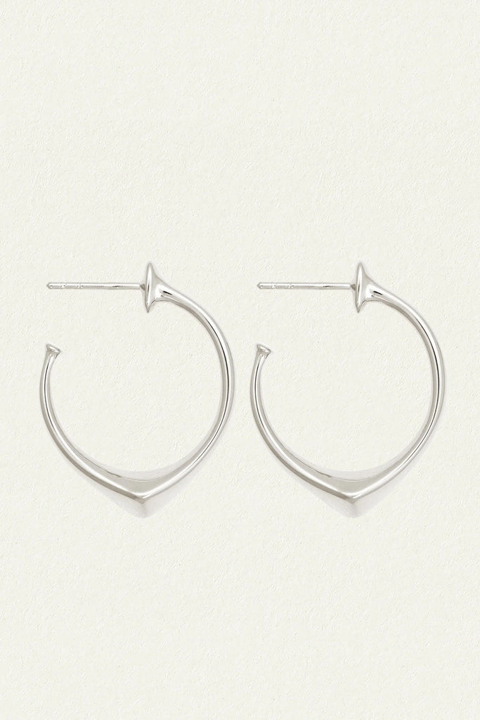 Handcrafted in recycled sterling silver, these open hoop earrings are distinguished by their angular silhouette, with a polished knife-edge profile that tapers to a soft point. Sleek and sculptural, their reflective surface catches the light with each movement.