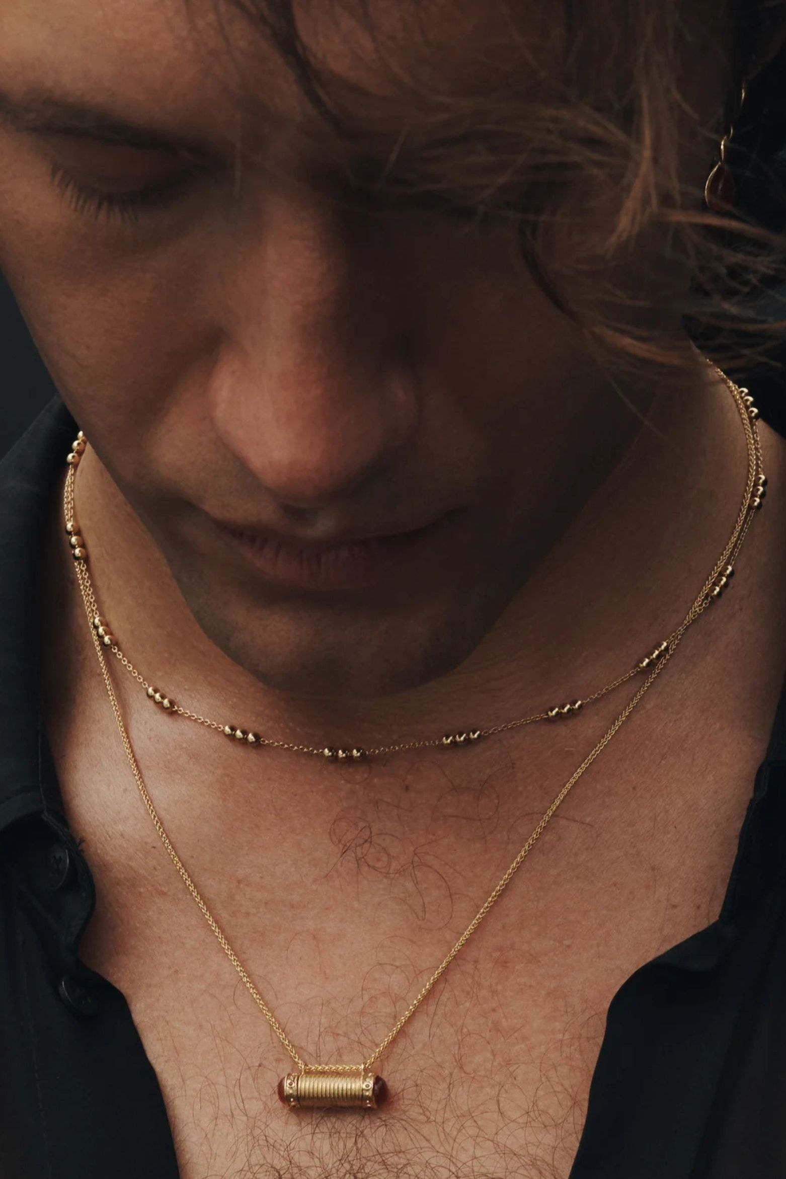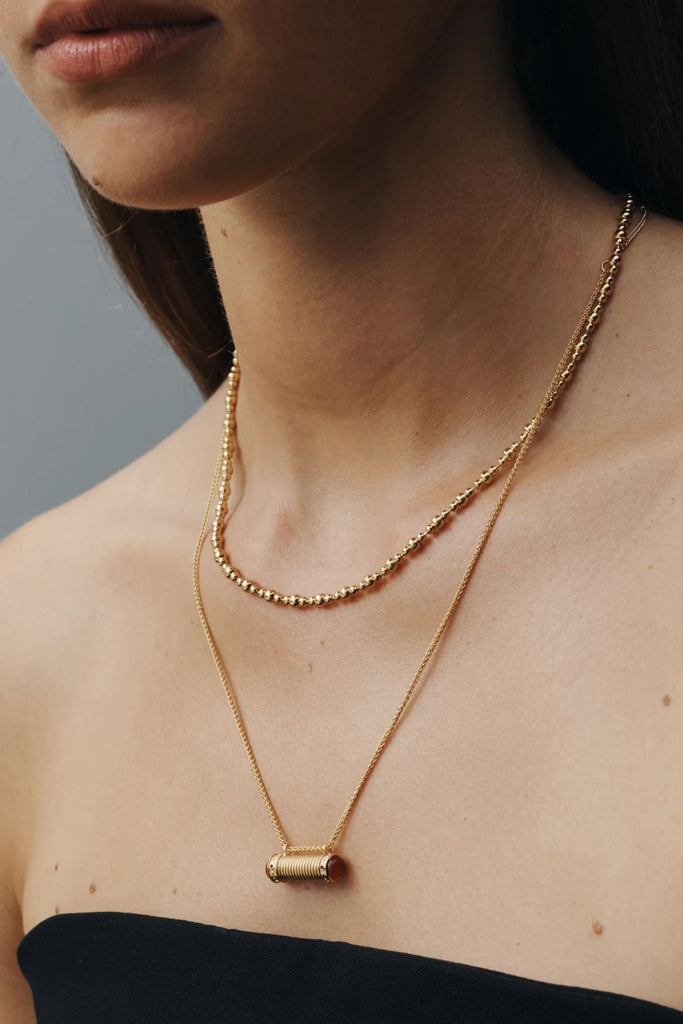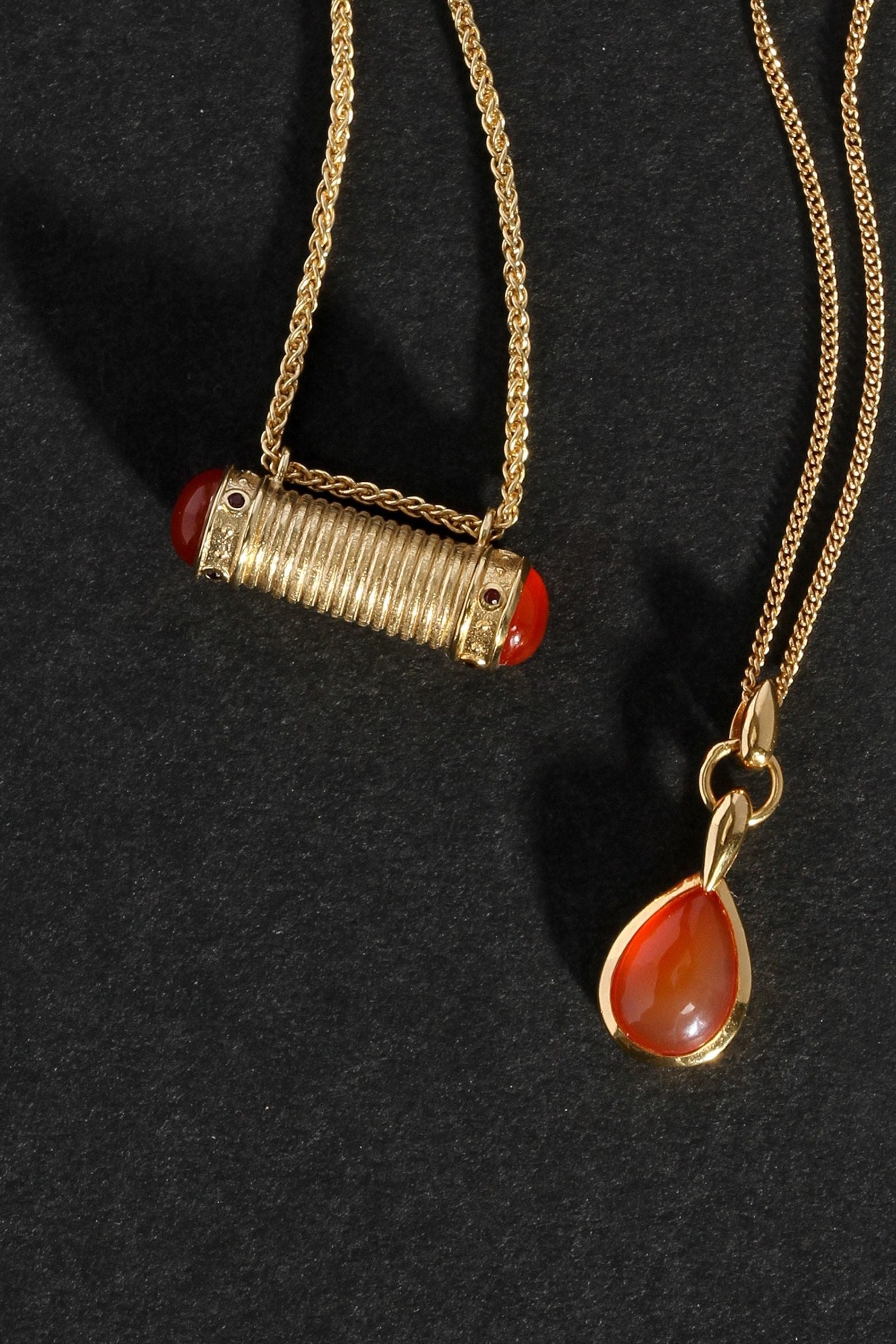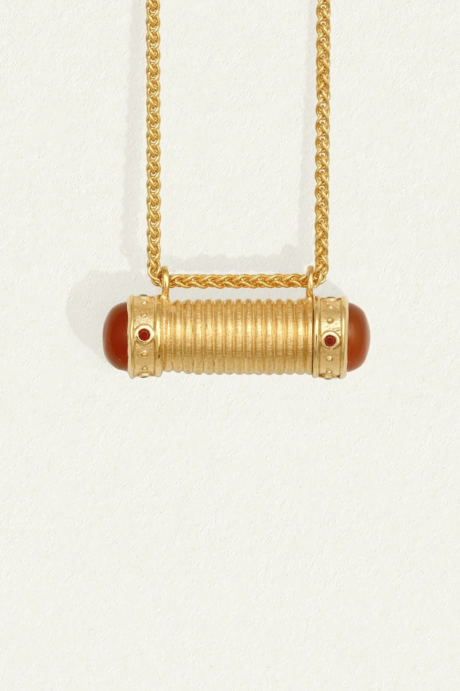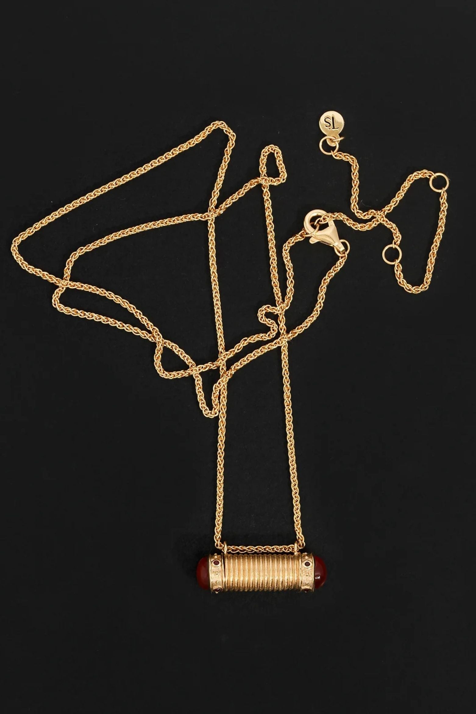 Handcrafted in 18k gold vermeil, the Sacred Scroll Necklace features a cylindrical pendant that unscrews to hold a small note or keepsake. The design is detailed with a row of garnets and capped with smooth carnelian cabochons, symbols of vitality, courage, and protection.