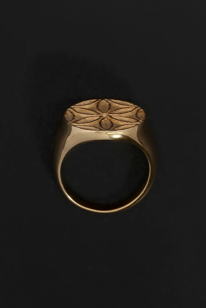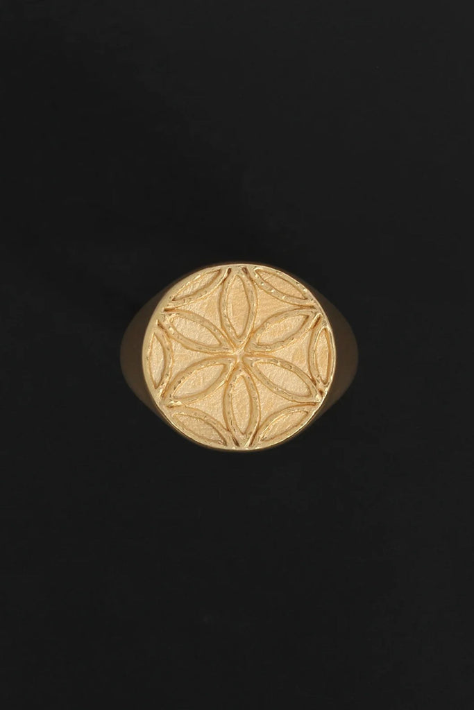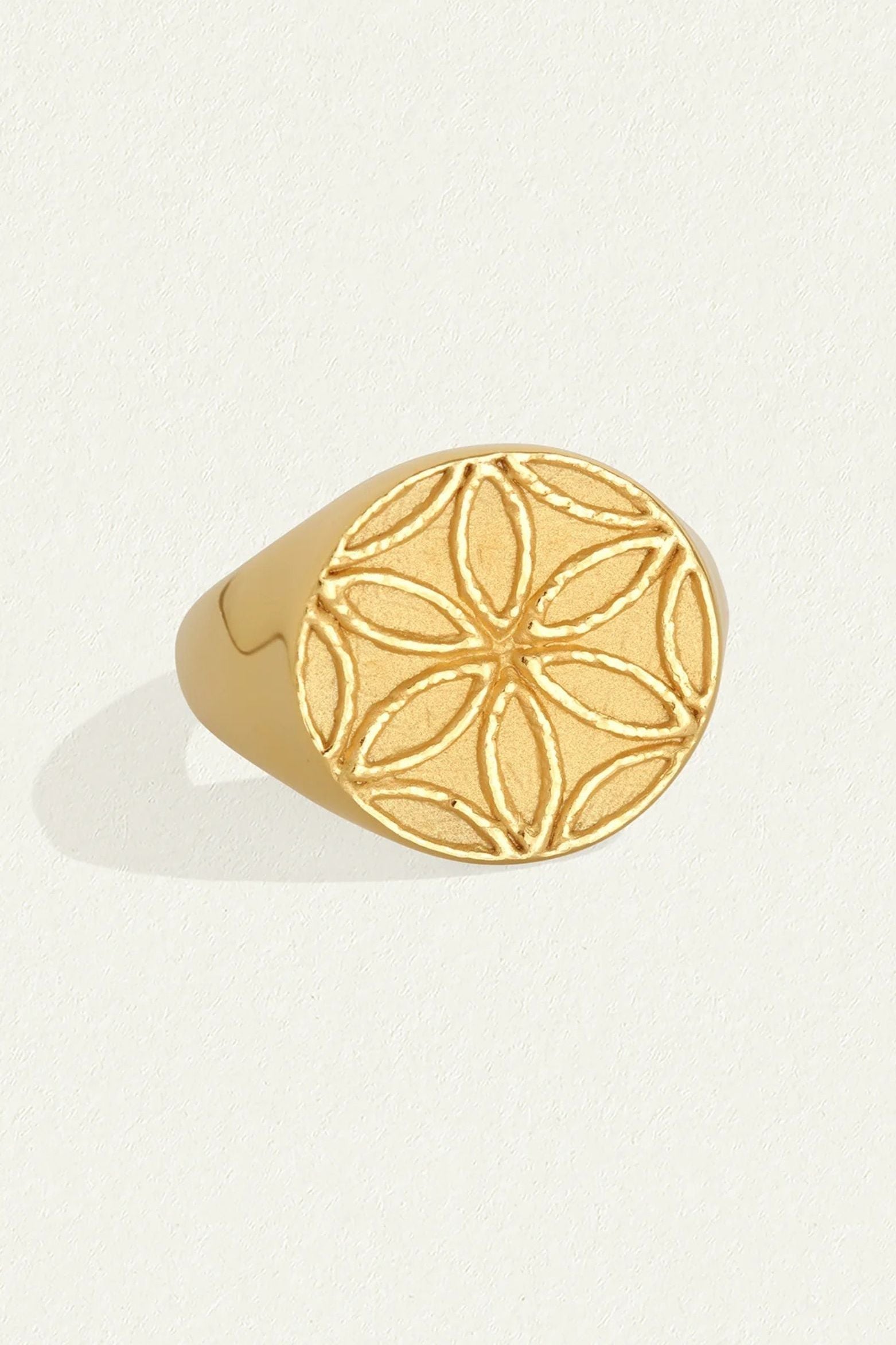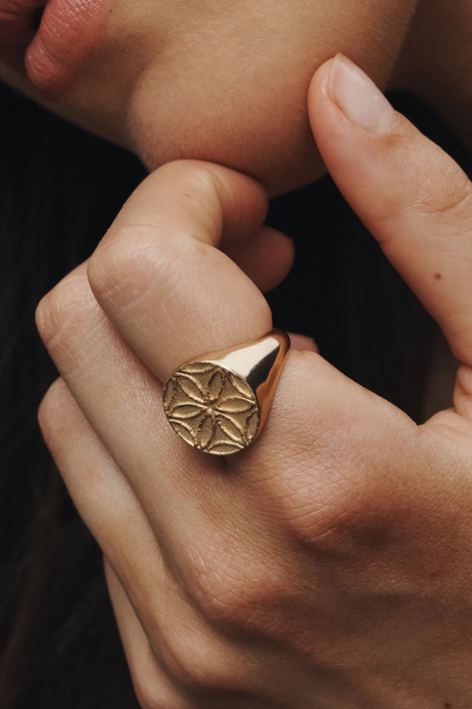 Crafted in 18k gold vermeil, the Seed of Life Seal Ring reimagines the traditional signet ring. Its circular face is debossed with a floral motif inspired by sacred geometry, adding texture and depth to the smooth polished band. Also available in men’s sizes.