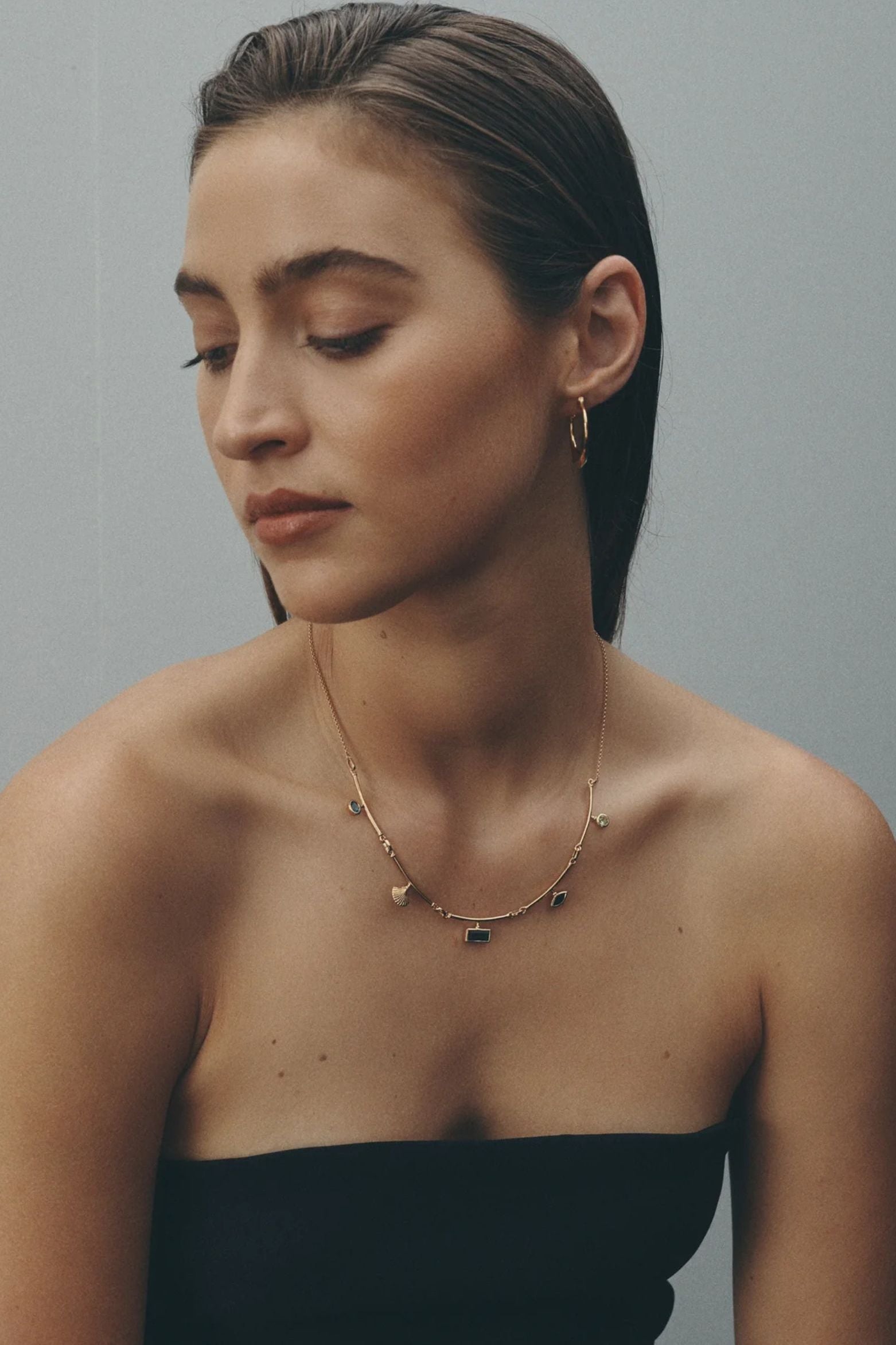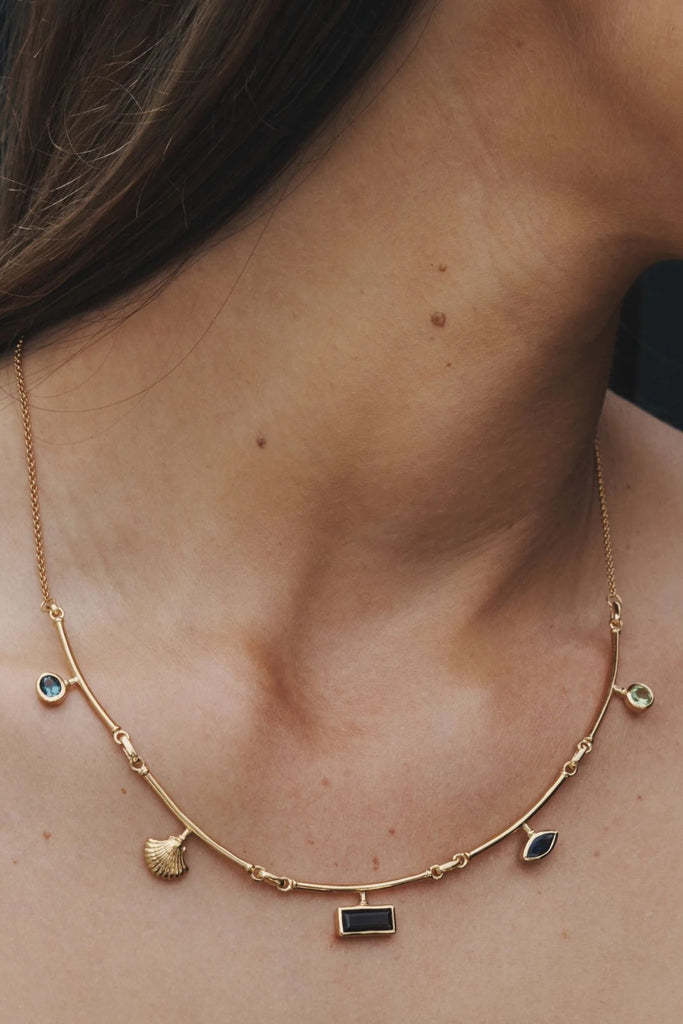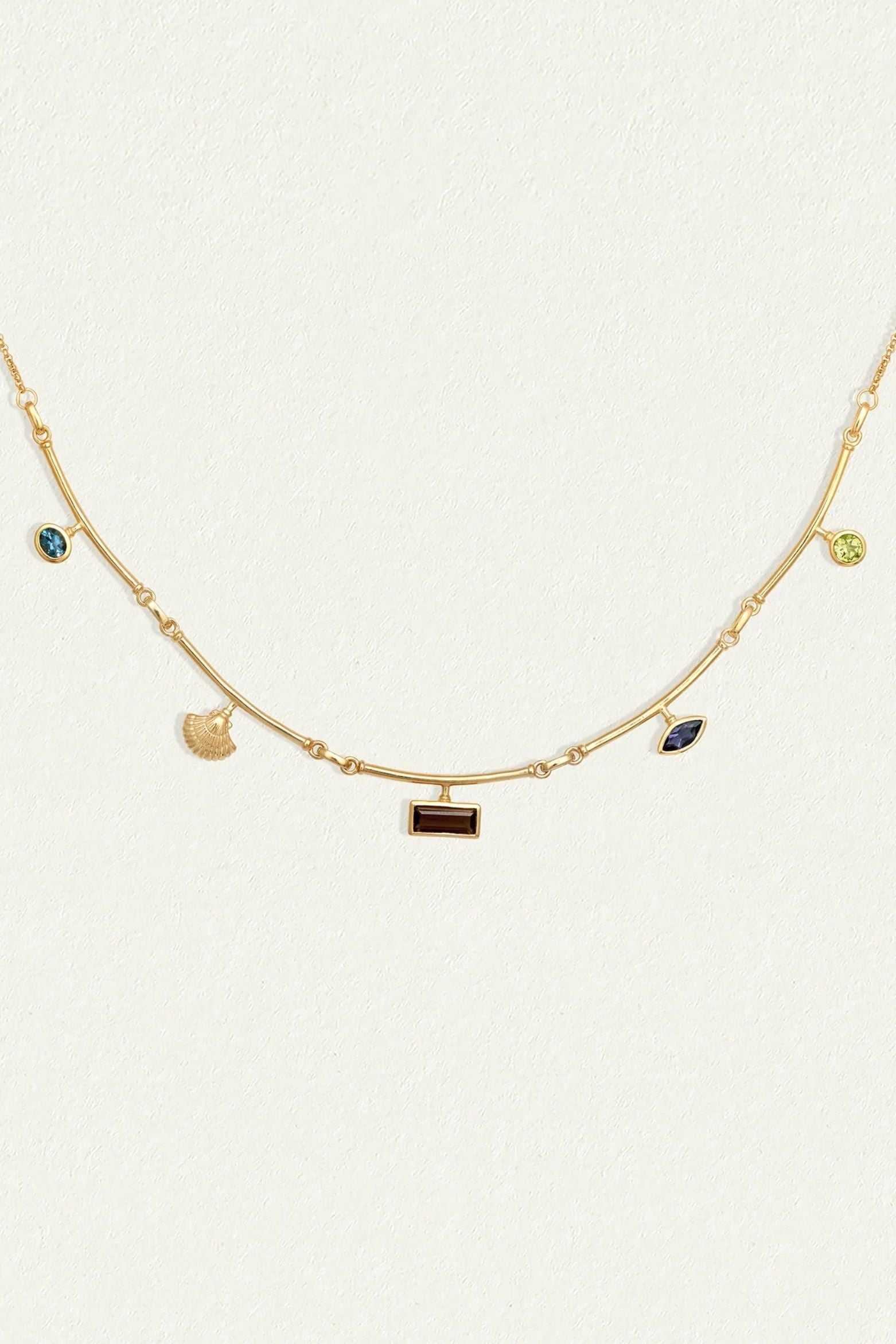 From an 18k gold vermeil rollo chain extends a sequence of polished bars adorned with ocean-inspired details: a scallop shell, oval-cut blue topaz, baguette-cut smoky quartz, marquise iolite, and round brilliant-cut peridot. Arranged in an asymmetrical design, they shimmer with colour and movement, evoking treasures washed ashore.