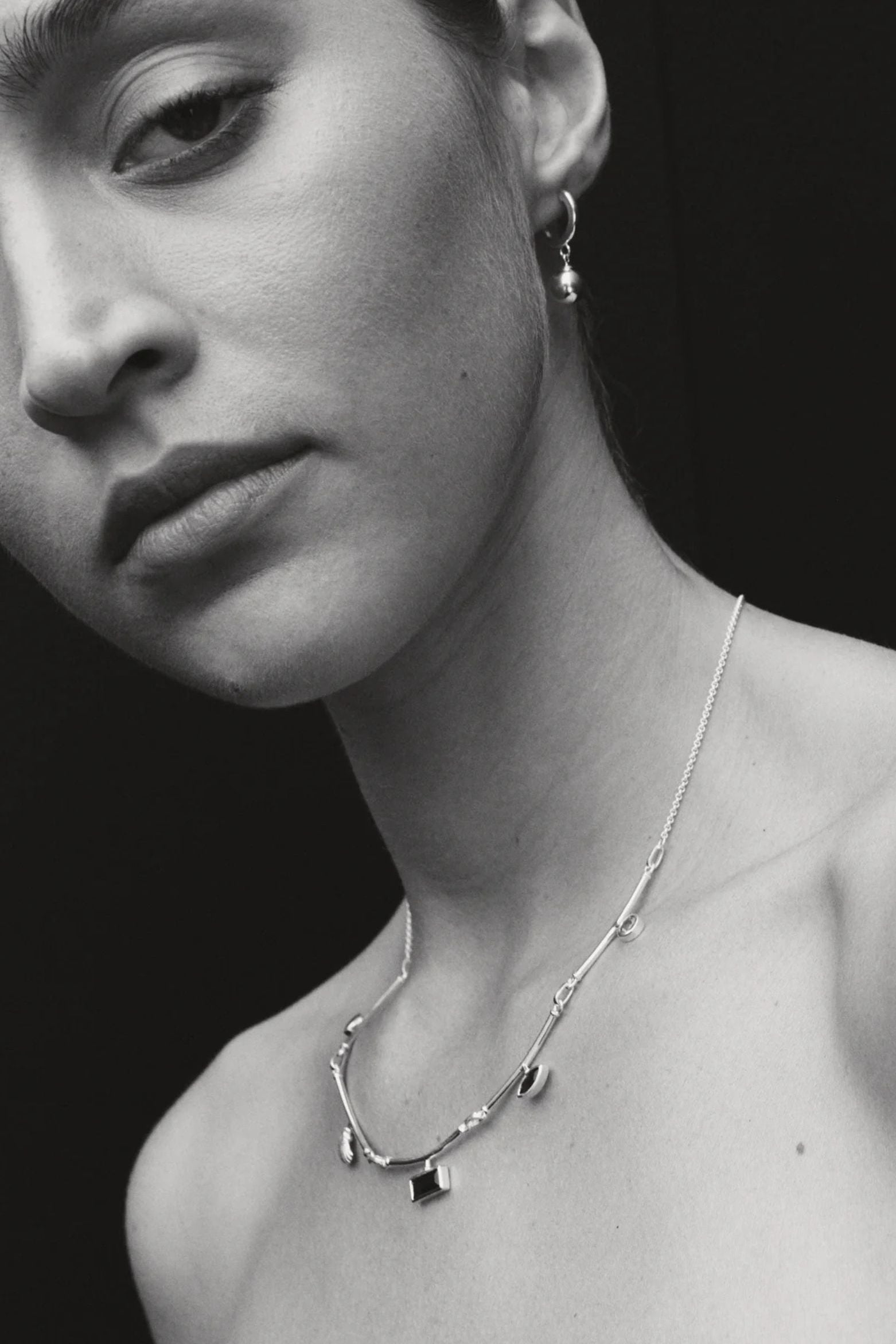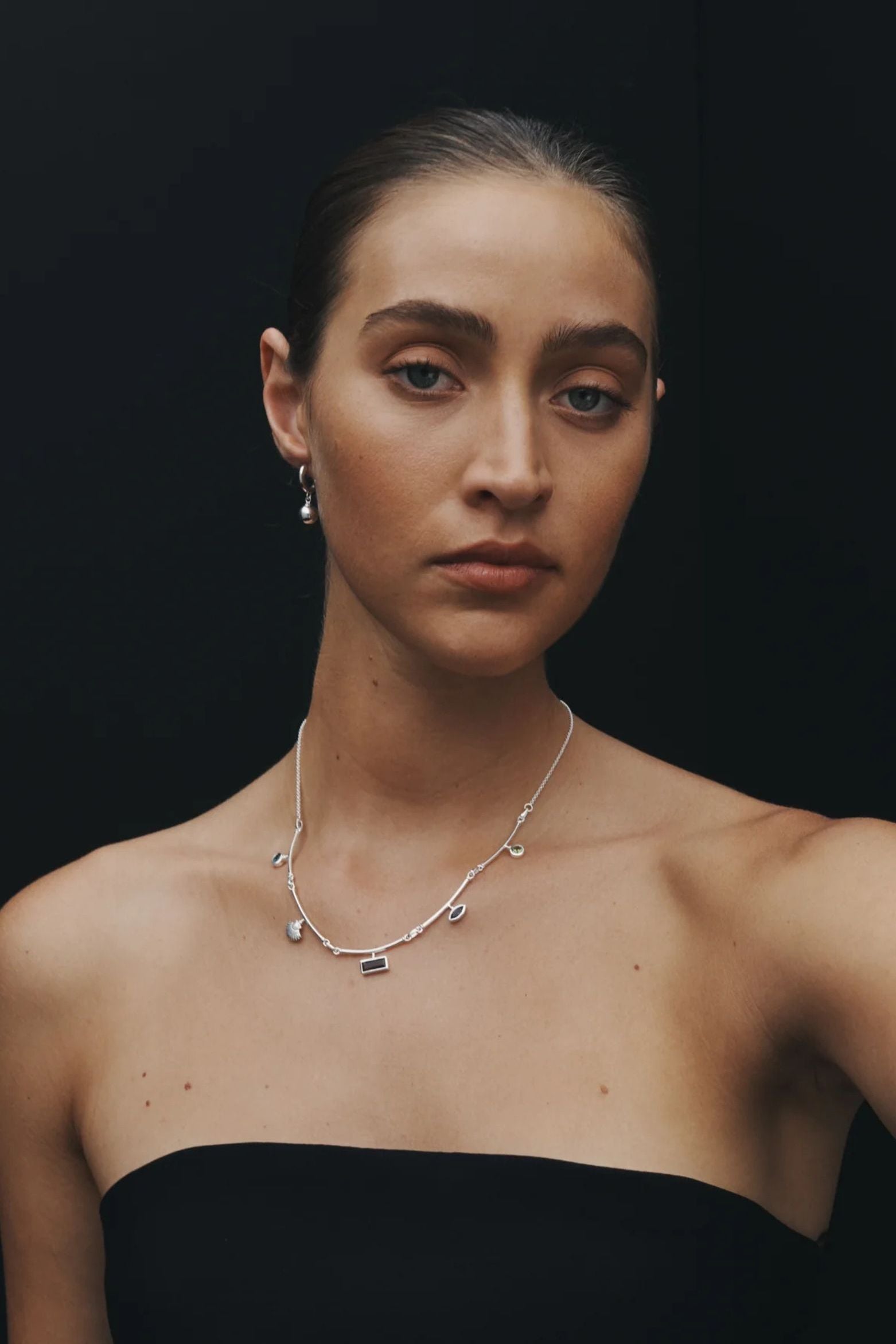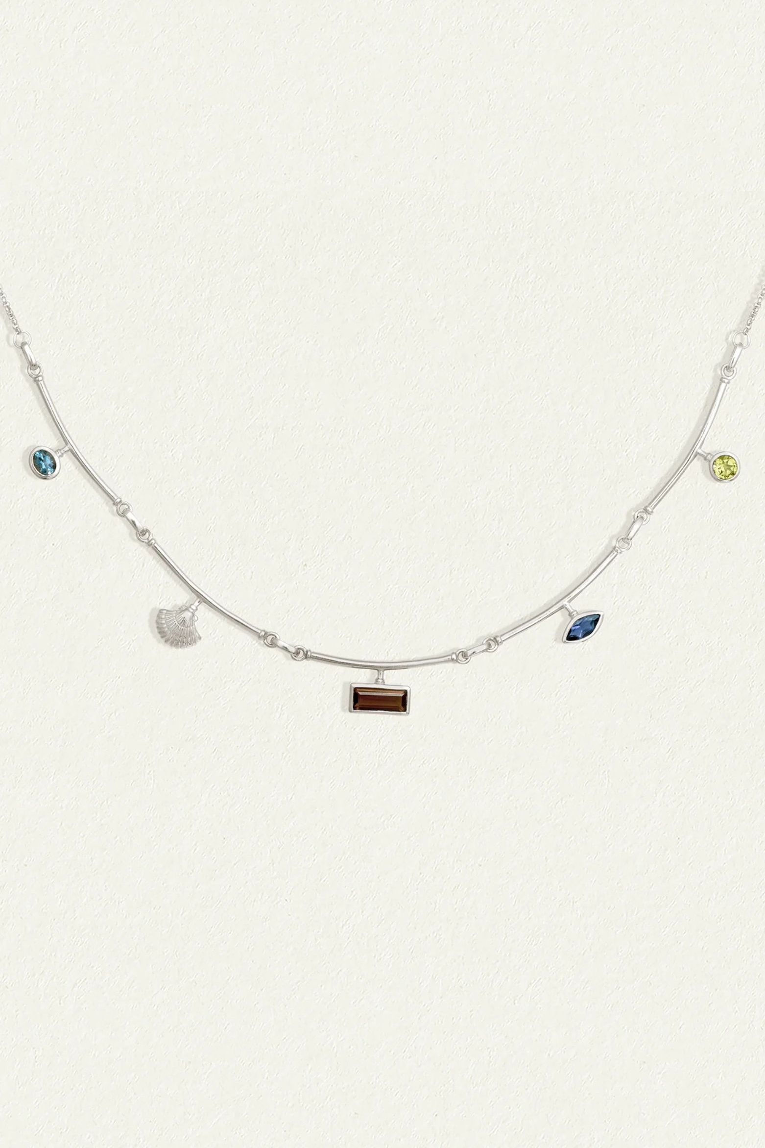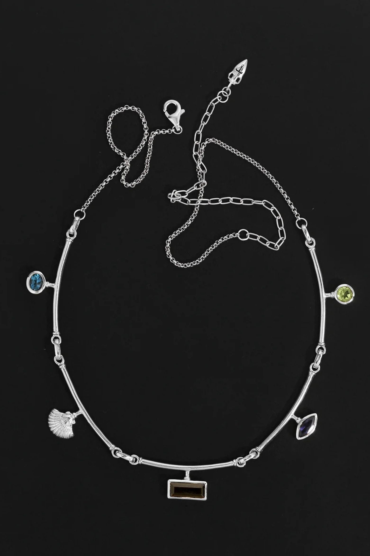 From a recycled sterling silver rollo chain extends a sequence of polished bars adorned with ocean-inspired details: a scallop shell, oval-cut blue topaz, baguette-cut smoky quartz, marquise iolite, and round brilliant-cut peridot. Arranged in an asymmetrical design, they shimmer with colour and movement, evoking treasures washed ashore.