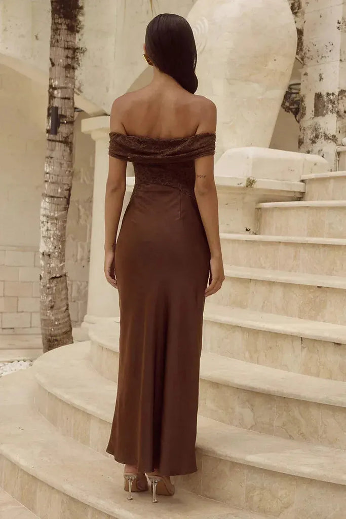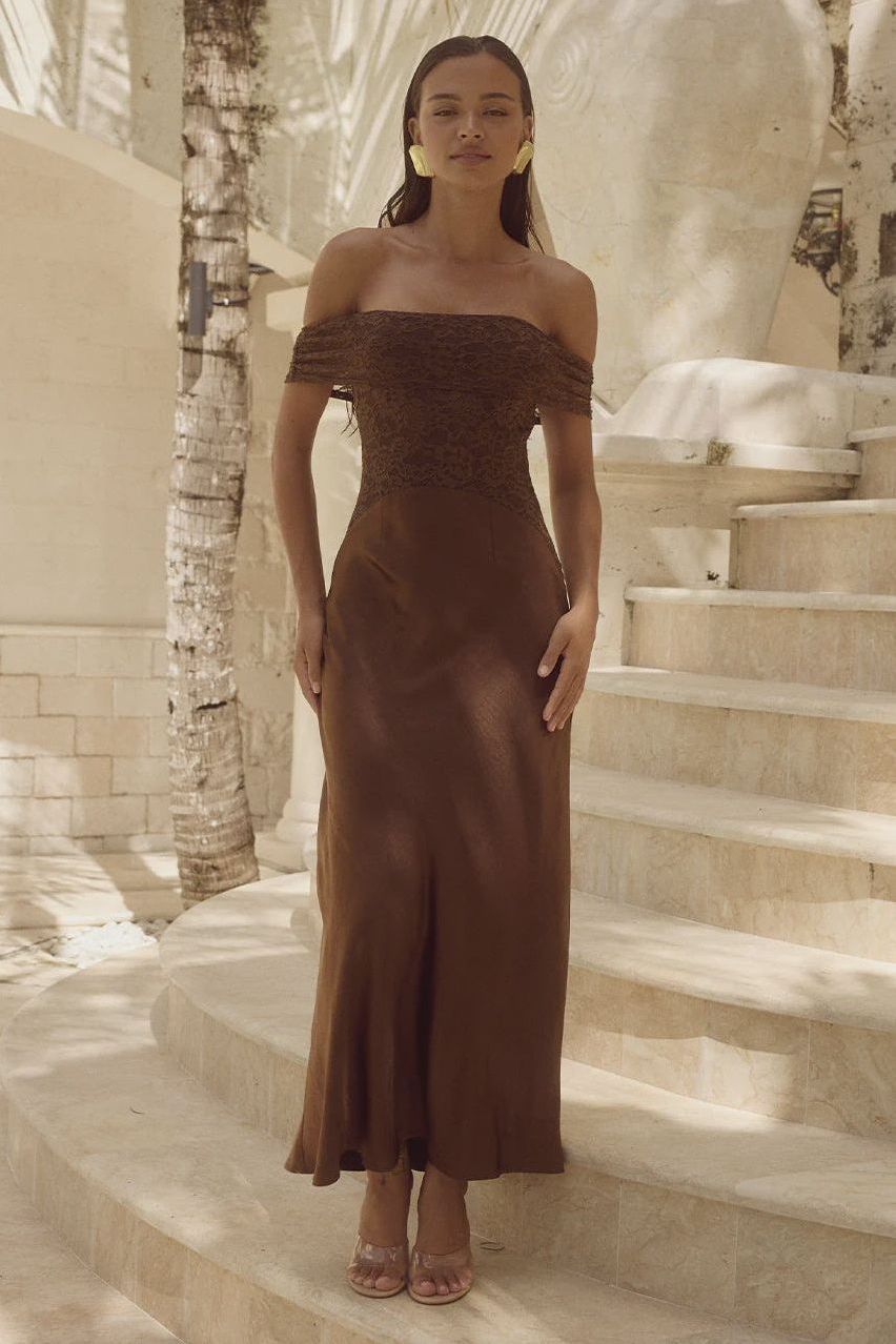 Our Amoret Midi Dress features a lace contrast and off the shoulder neckline in a rich espresso hue, for a sexy feminine look.