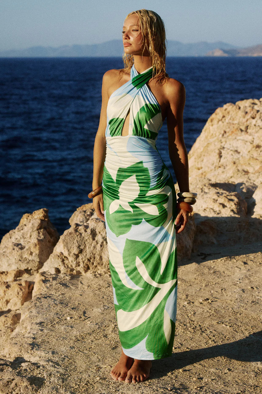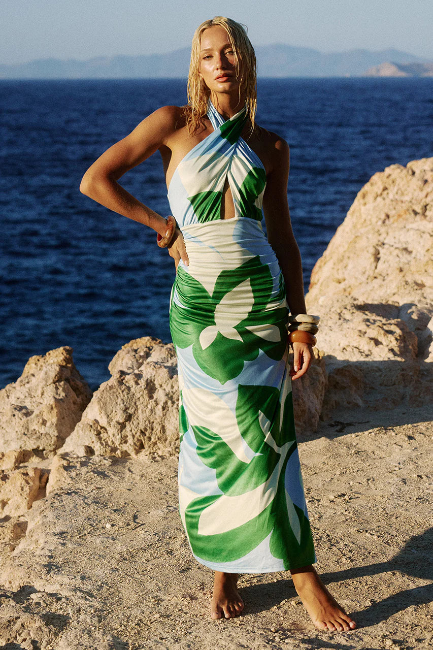 Our Aubrie Cut-Out Maxi Dress features a bold print in fresh green and sky blue tones. With a flattering halter neckline and side split detail, it’s made for sun-drenched days and evenings by the sea.