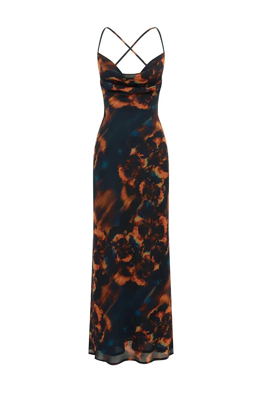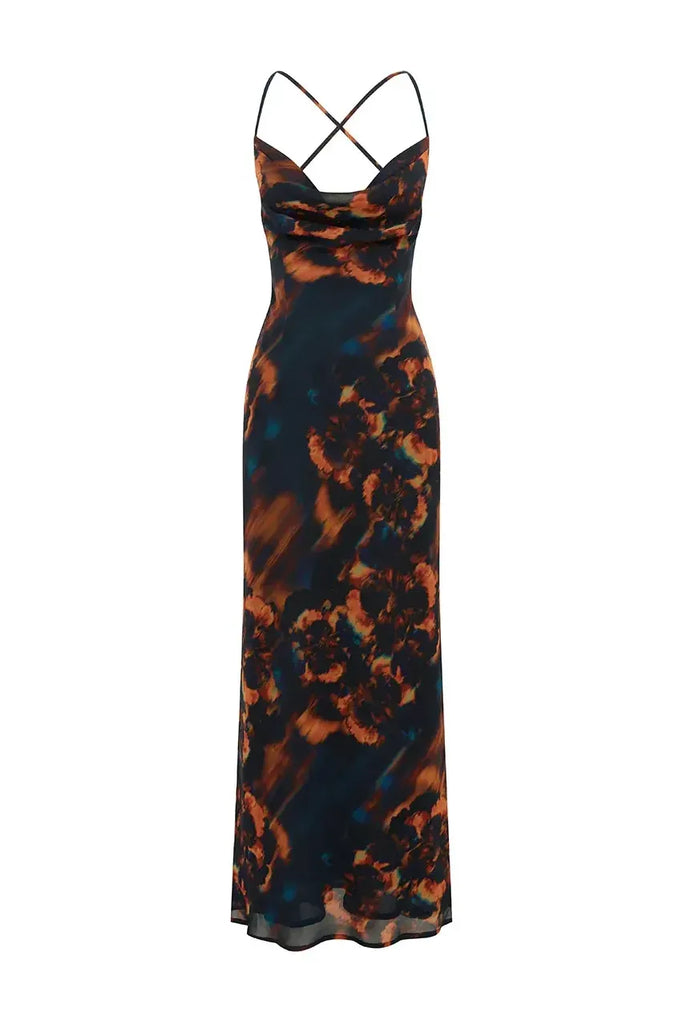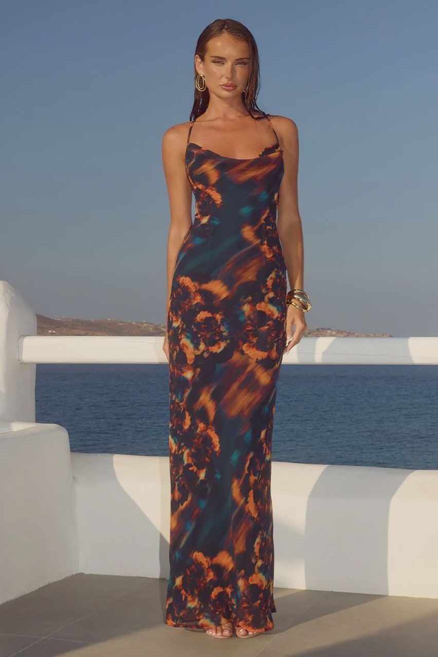 Featuring a cowl neckline, an open back and a bright floral placement prints, the Bridgette Maxi Dress will be your statement piece this season.
